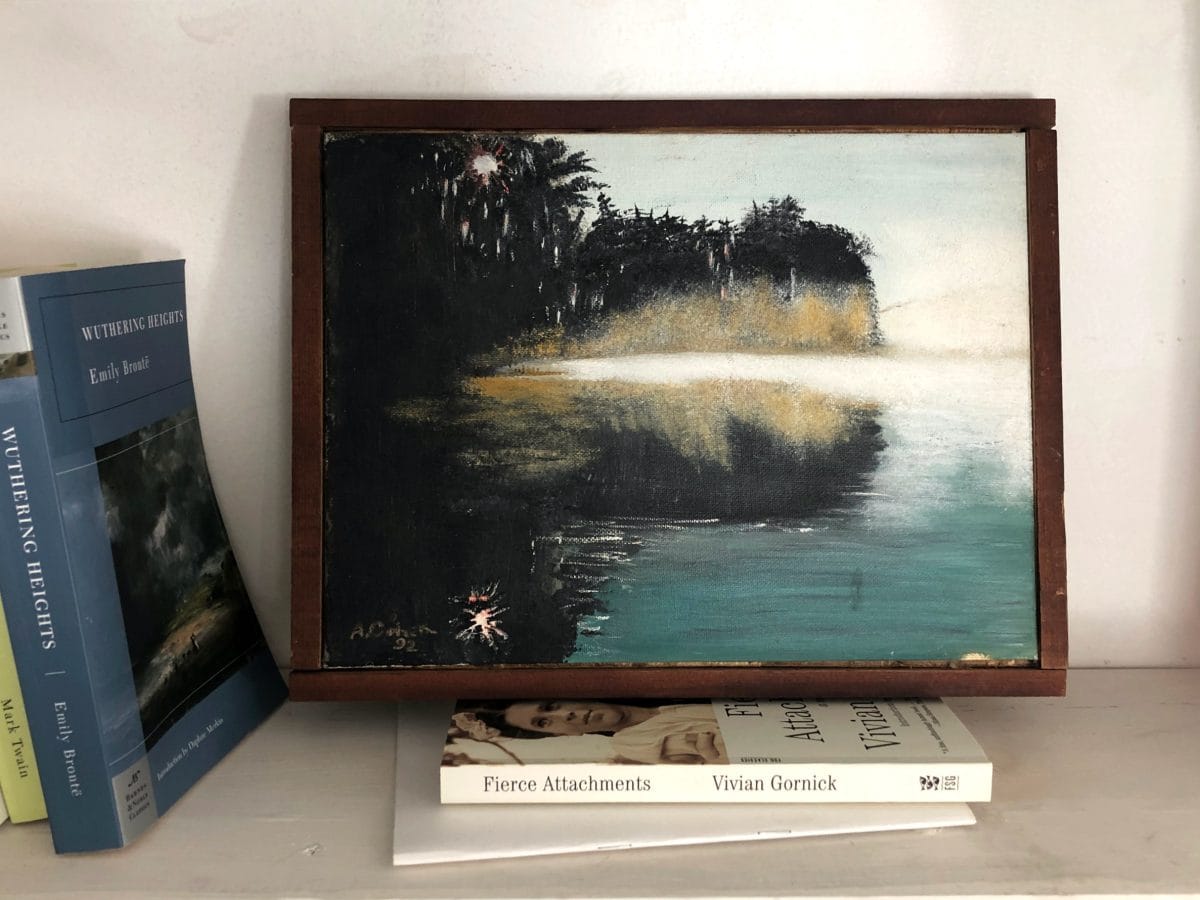 Although the cabin is still in the family, my parents are elderly and no longer go. I worry about them dying from COVID-19 as I grapple with the reality that I’ll never see my friend Norma again, who died after Christmas, and my friend Patrick, who overdosed last spring. In the little painting the sun is forever rising, making the distance from here to there feel like an ever-widening abyss. We always knew there was going to be a tipping point with the environment and as I look at the painting I wonder if this is it.