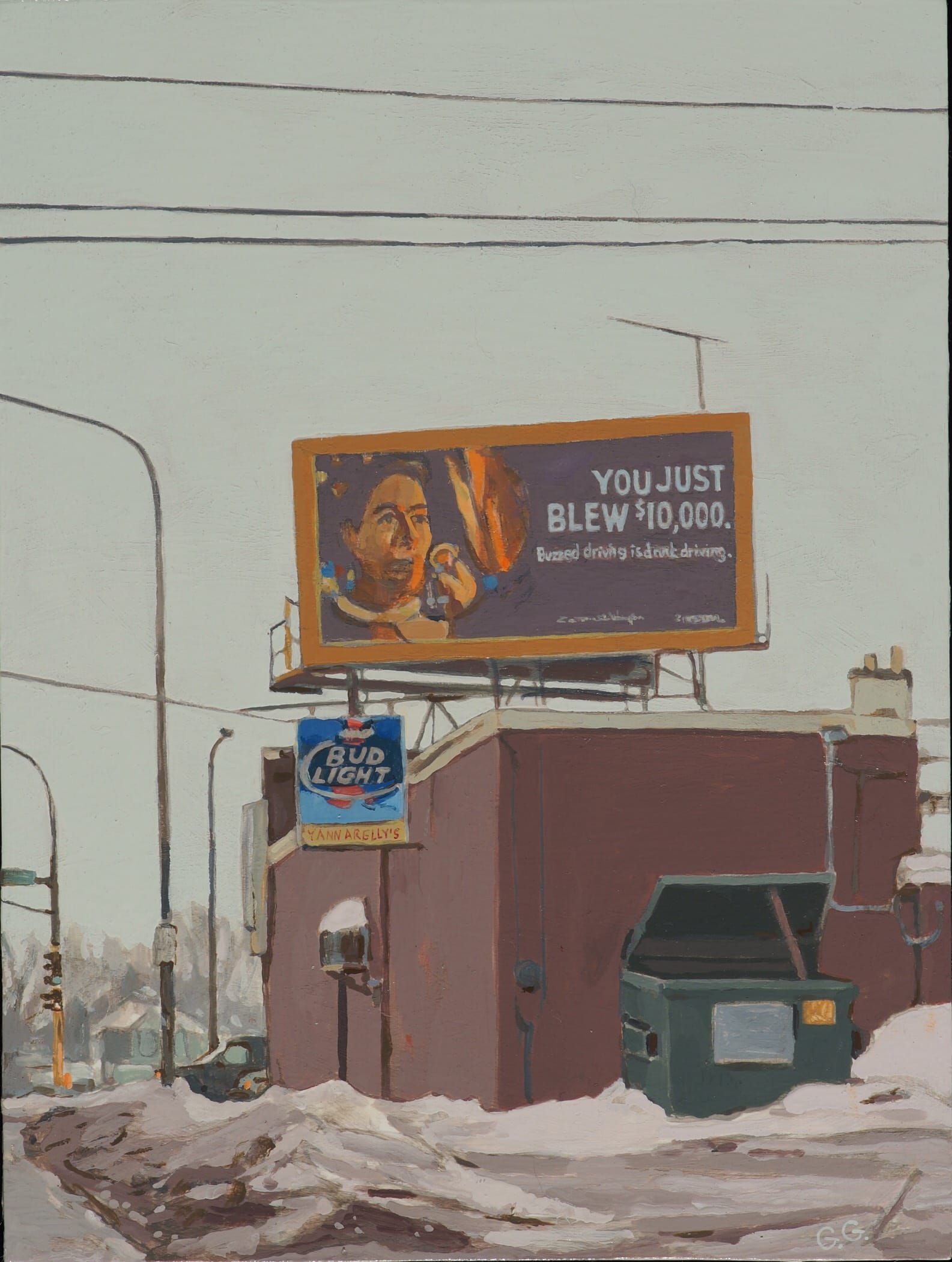 Ken Johnson (Minneapolis, Minnesota): “Yannarelly's Bar,” by my friend Greg Graham, was done in enamel, traditionally a crafters’ paint used in finishing model cars and airplanes. Greg felt challenged to attempt using this medium as a fine artist might, despite the peculiarities and limitations of the medium (few color choices, high gloss). He developed a working method and did a series of small paintings on panels. The one I own depicts the rear of a bar once located on the east side of Saint Paul on a gray winter day, dirty snow humped up on the curb, a dumpster propped open, an anti-drunk-driving billboard curiously looming above. I admire Greg's evocative sense of color (I particularly love his subtle grays accented with the siennas that give the painting some heat) and the delicate brushwork necessary to make such a small painting work.