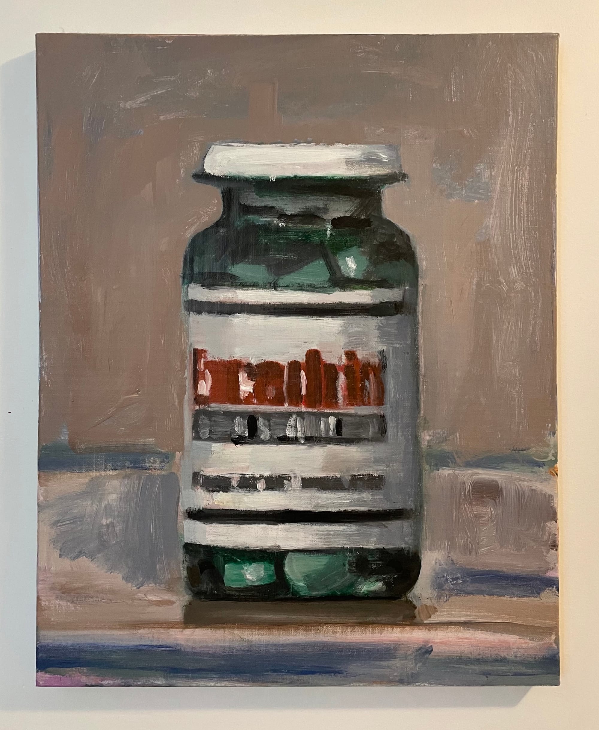 It is with this newfound fragility that I write about my beautiful Walter Robinson, “Painkillers,” a contemplation on aging (I’m sure) delivered in his deft, matter-of-fact hand. The Excedrin bottle is centered and bold over an underpainting of muddy indigo peeking through a thin layer of violet-brown. There’s a fleeting sense of Morandi, had he indulged life rather than cloistered himself from it. No fireworks, no pointless flourishes. Everything is presented, plain as day and warm like life. The artist is indifferent to style because that would interfere with the matter at hand. It would be too on-the-nose to illustrate the magical powers contained within its amber shell. It would be Jesus as lion rather than lamb. The bottle glows like a chalice regardless.