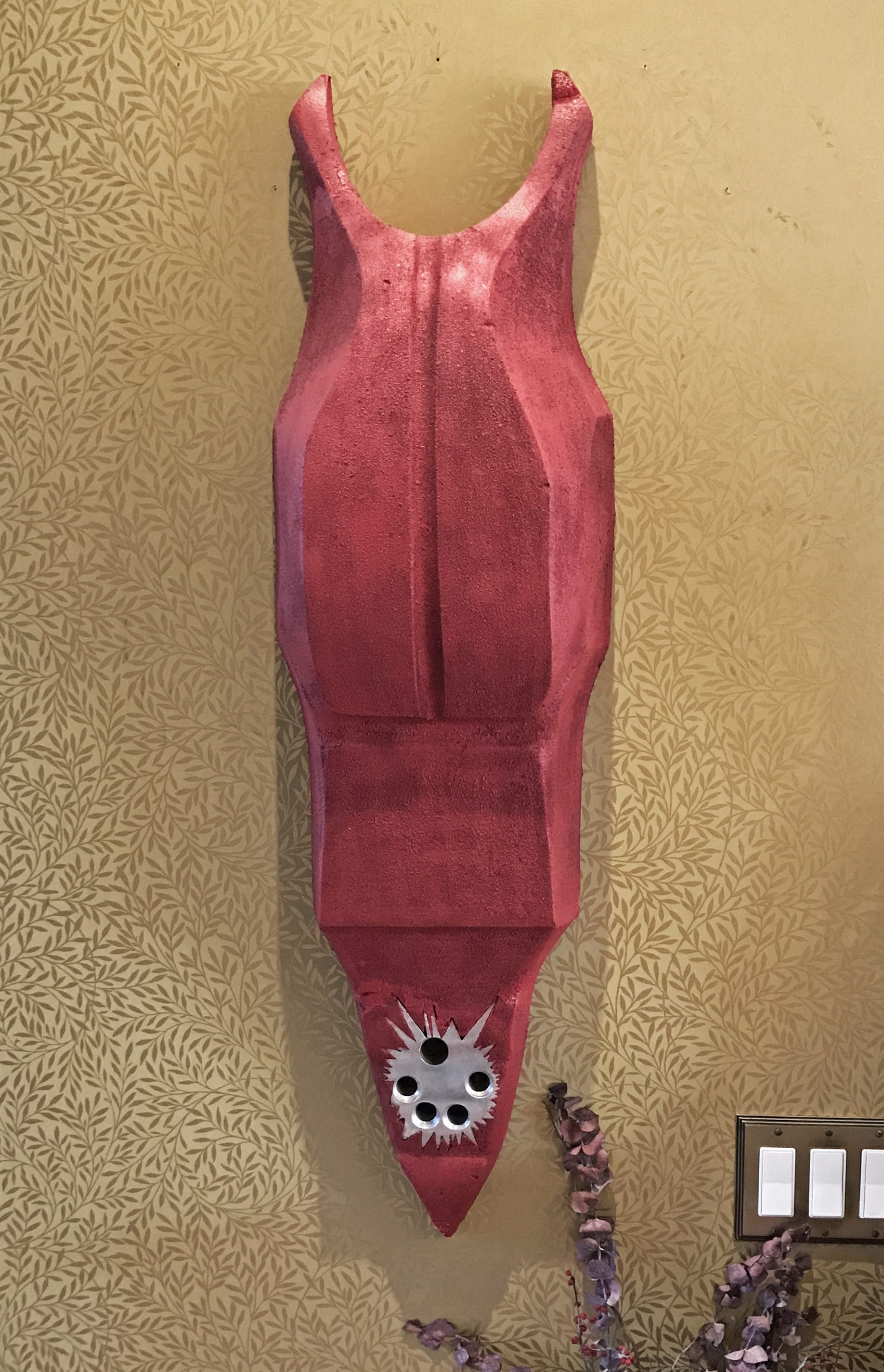 After Kevin died, in 1997, the piece ended up with my mom (though unfortunately a lot of his other art went unaccounted for). In 2000 I moved to New York City and had our mom send us the piece, by now dirty and battered. My wife and I moved quite a bit within New York and the easiest way to transport it was to carry it like a bowling ball using the handle, so I’d walk across town or onto the subway with it rather than risk damaging it by putting it in a box. A decade later we moved to Africa so I sent it back to my mom. In 2019 we moved back to the US and bought a house, so on a subsequent trip to California I sent the object back to myself. By this point it was in bad shape, so I had to restore the broken parts and repaint it.