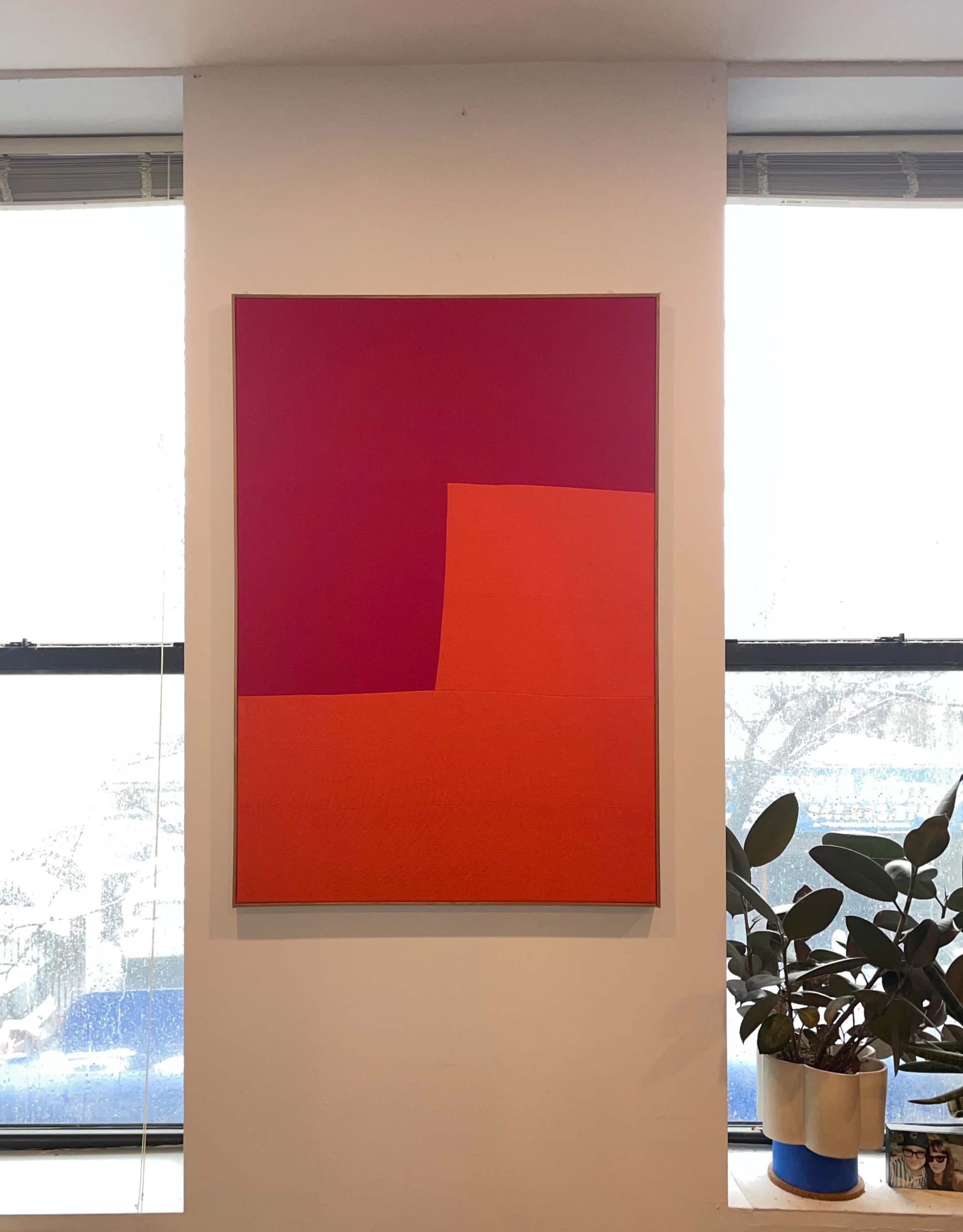 Trudy Benson (Brooklyn, New York): I have a beautiful Ethan Cook painting: a woven red and orange geometric piece about 40 inches tall by 30 inches wide. It’s evocative of the very beginnings of a log cabin quilt pattern, two rectangles at top and bottom couch two squares in the middle. (It has always felt like a rectangle made out of two wonky L’s to me, not unlike an Al Held alphabet painting).
