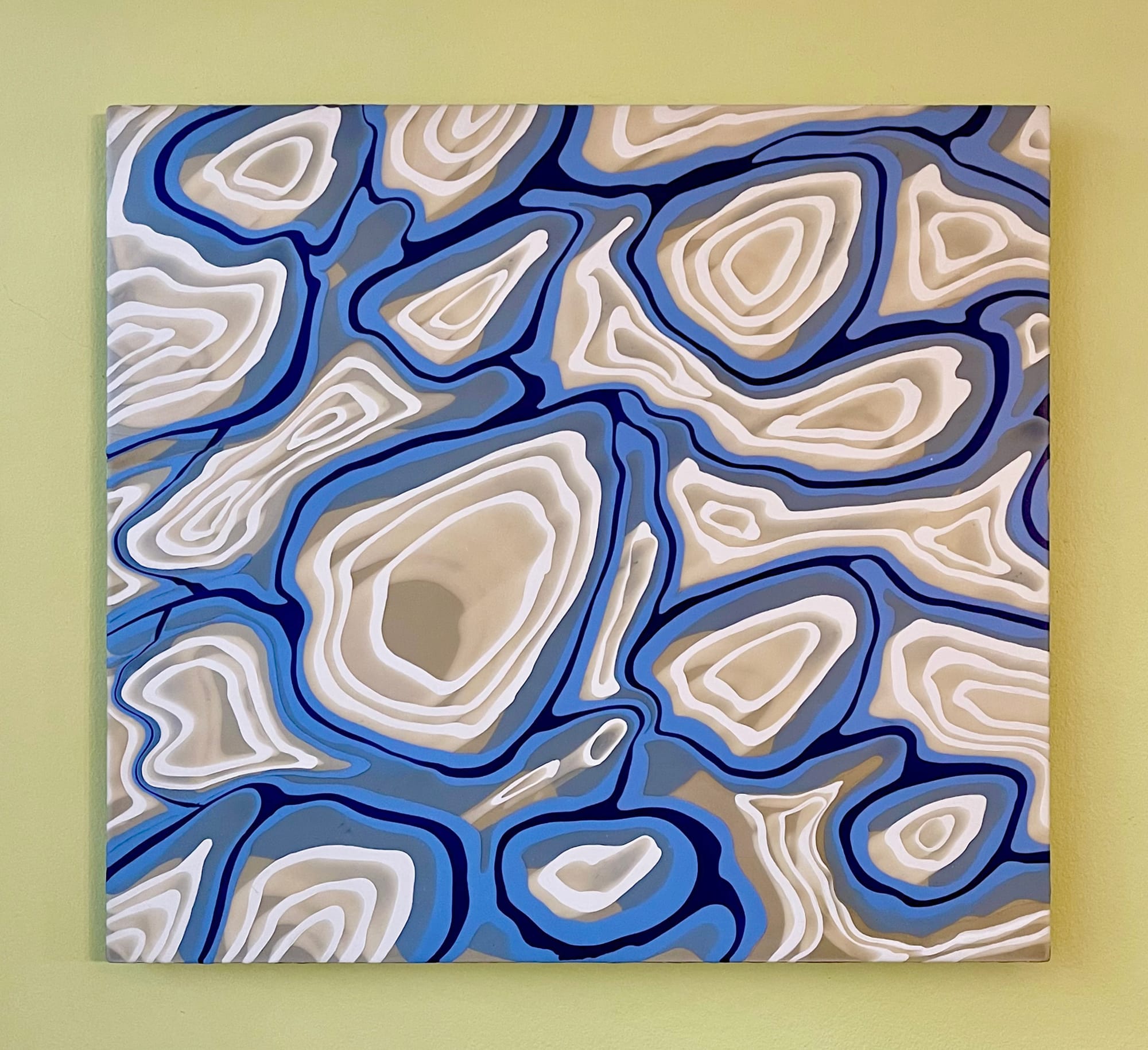 I’ve always felt that Kathleen is part scientist. For me this is a high compliment. The painting is part of a body of work that took years to develop because it required Kathleen to come up with her own way of painting. She developed a paint formula that enabled her to pour liquid acrylic onto a hard aluminum surface where time and space are suspended, not unlike the way I feel right now.