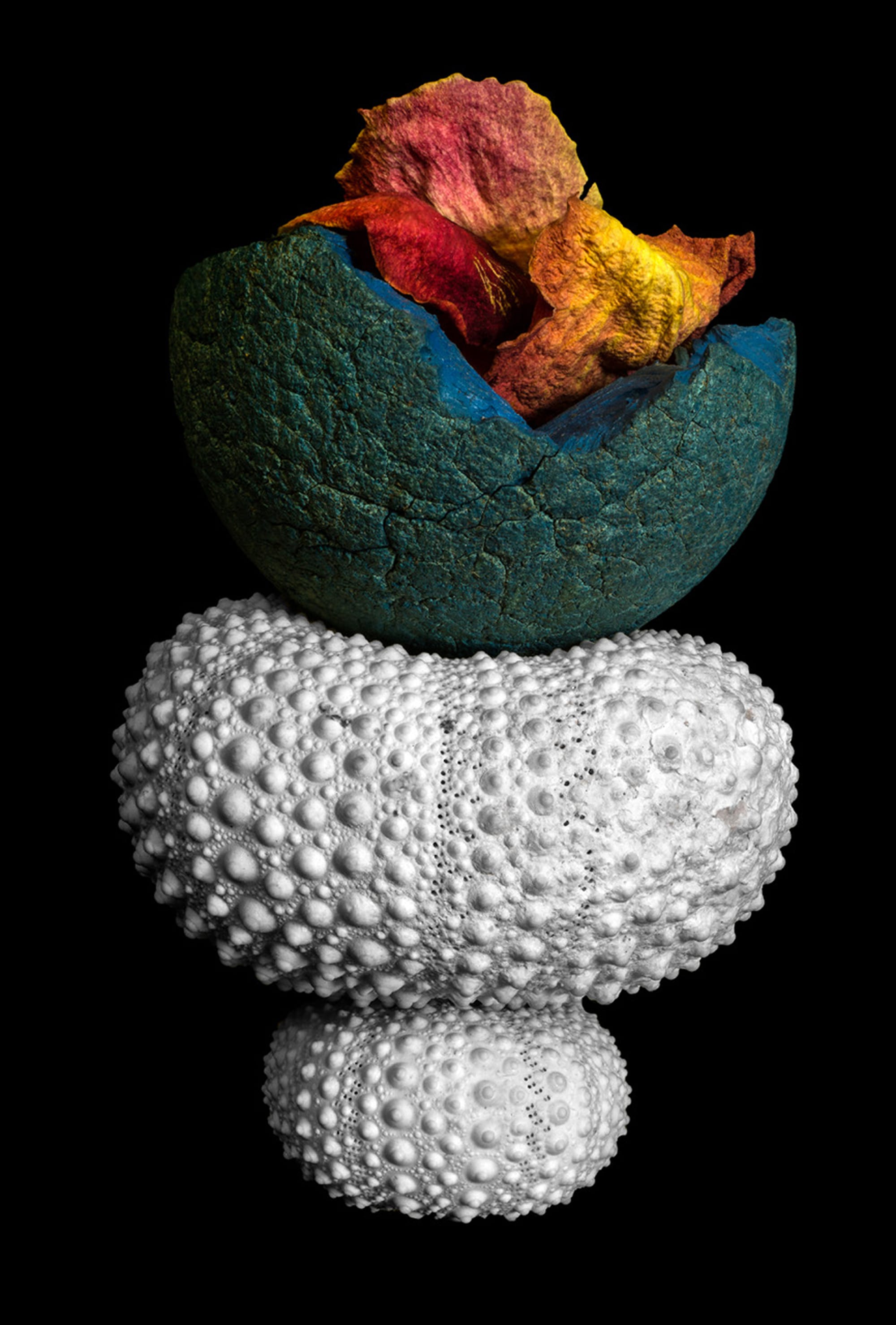 Allan’s photograph, “Urchins, Ball, and Rose Petals,” is framed on a wall by my computer, so I see it every day. In it, one larger-than-life sea urchin sits atop another, and on them rests part of a wrinkled and splayed-open greenish blue rubber ball and a few weathered old rose petals. All are completely surrounded by blackness, now a metaphor for the darkness that has surrounded the world in the past year.