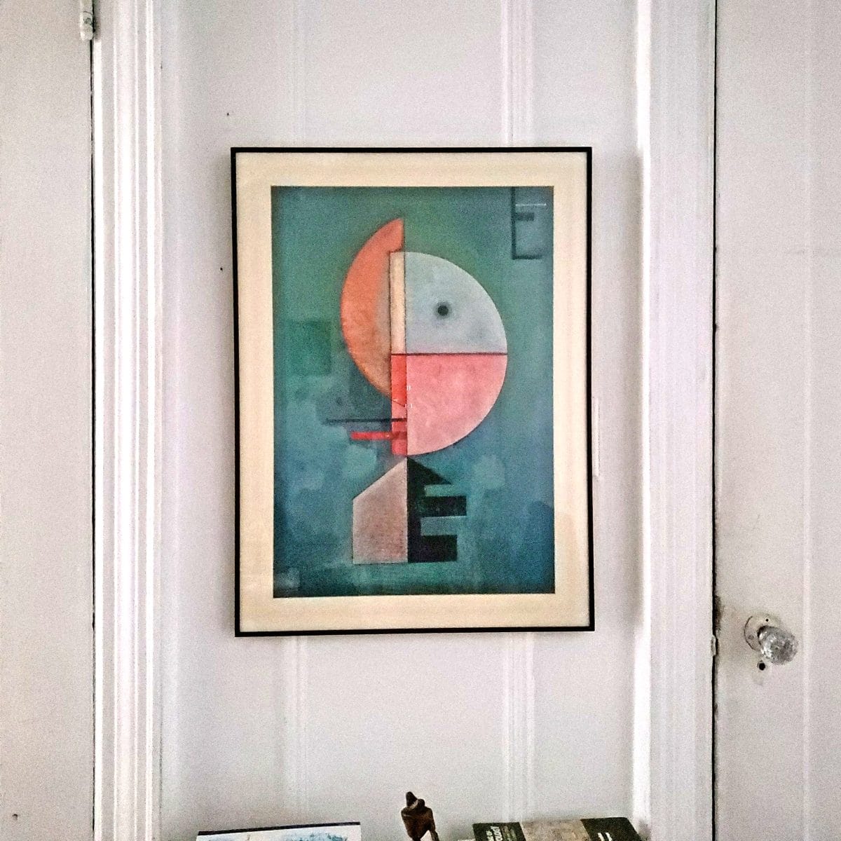 Sika Foyer (New York City): I have always been fascinated by this reproduction of Kandinsky’s “Upward” (1929). The simple lines, geometric figures, letters, and color composition appeal greatly to my taste for abstraction and symbolic representations in which viewers need not call on their racial and cultural biases to appreciate the artwork. I admire how Kandinsky was able to do so much with so little, balancing geometric half circle-arcs atop a triangle/rectangle combo anchored by the letter E (unfinished) that some critics thought represents the “E” in the German title, “Empor.” The lines forming lean rectangles are strategically distributed to hold the piece together, like the masonry of a pillar — all embedded in a rich field of turquoise green, an oceanic pasturage where life can begin again. The tiny dot or point that could be the eye of a small bird did not elude me either.