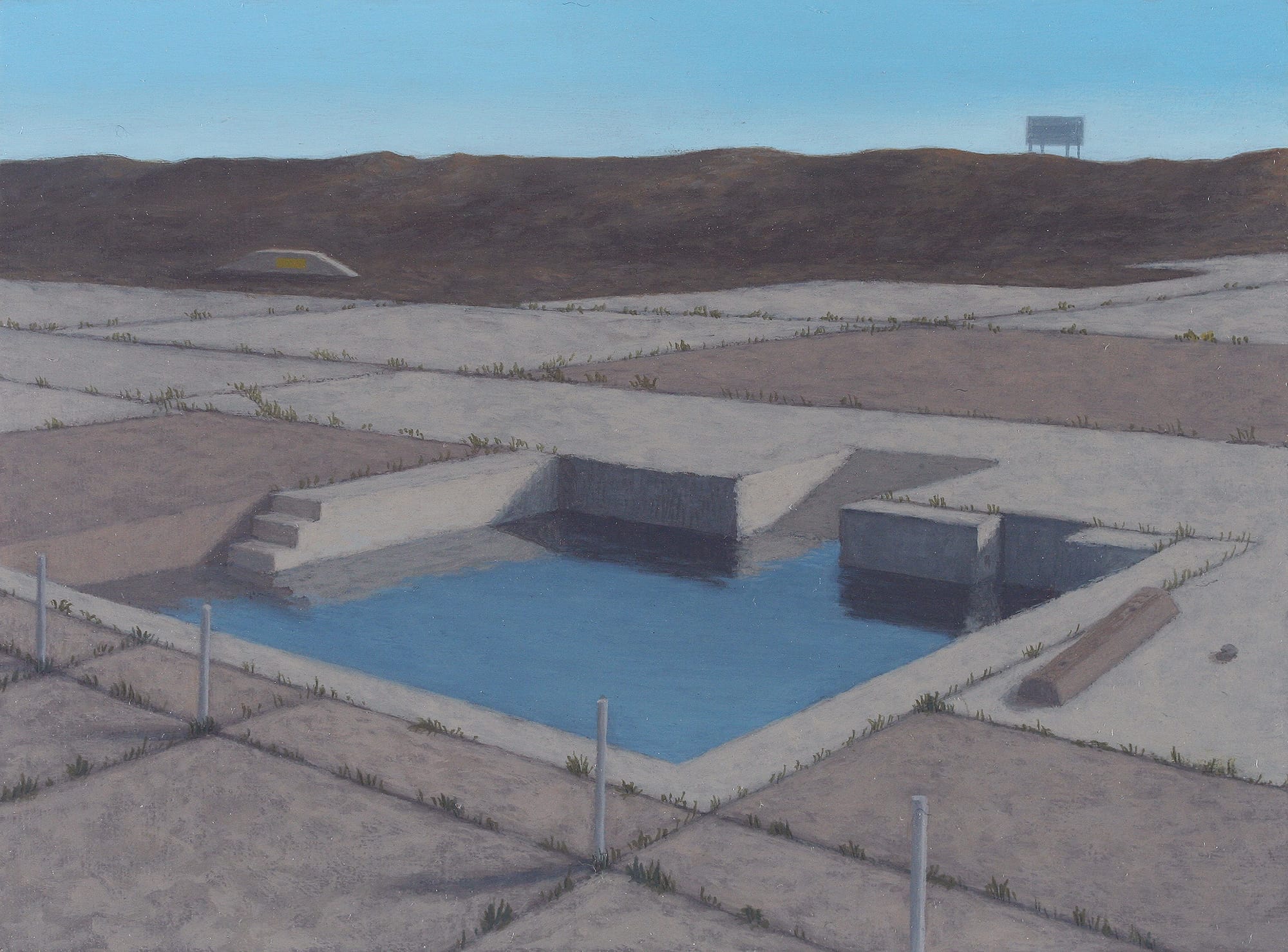 Now, a year into the pandemic, what was merely sad feels dystopian, tragic. And after a session of doom-scrolling, I can even see it as post-apocalyptic. But, wait — that tiny billboard! This quarter-inch rectangle of pale gray on the horizon assumes a significance far beyond its physical presence. A lovely formal choice now becomes loaded with meaning. Could it be hope? A message about the future? Nora’s decision to introduce a beautiful blue by filling the foundation with water strikes a hopeful note, too, as does the grass sprouting between the slabs of concrete. And what is one to make of this tender, loving rendering of such a desolate view of the world? It feels both generous and optimistic.