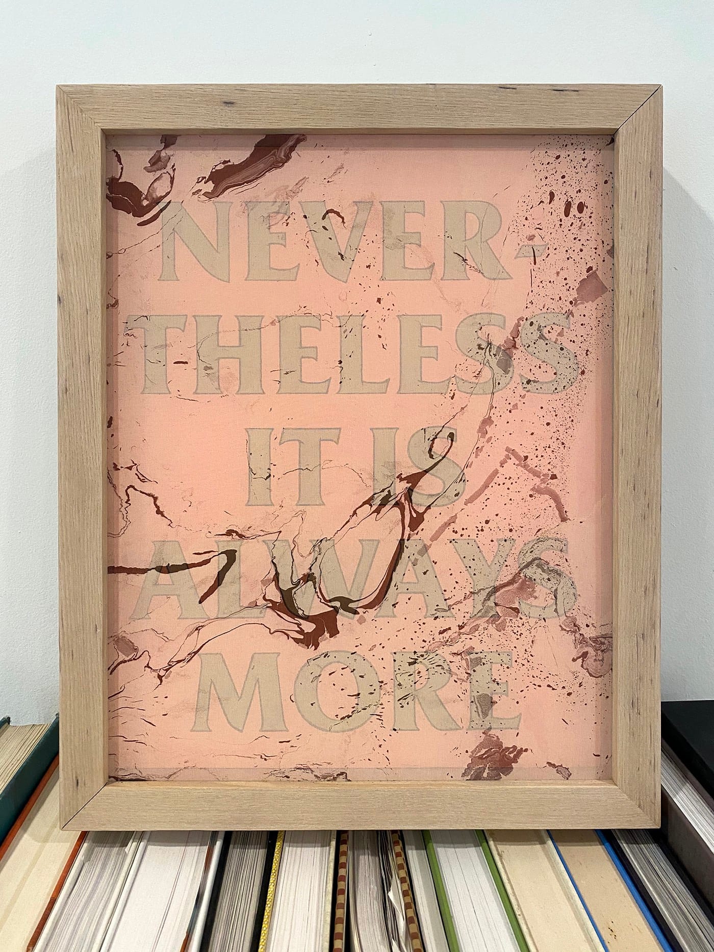 Ryan Crotty (Auburn, Nebraska): In February I acquired a text piece titled “Nevertheless” by Vancouver artist Ben Skinner. It is an unquestionably gorgeous art object, part painting, part sculpture. Acrylic marbled silk chiffon hovers just over acrylic and graphite on birch panel, suspended by a built-in frame. This work, perhaps selfishly, fulfilled some shallow nostalgia, because it shared the title of my first solo exhibition in New York City. My Nevertheless was a riff on the Mies van der Rohe modernist adage, “less is more,” and suggests that there is more to consider and explore in minimalist color field painting. I chose the title because it felt distilled, shortened, as if it could be followed by ellipses, as if there was more to be said. I haven’t escaped the notion that the full phrase spelled out in Ben’s work was the completion of the exhibition title. Gently obscured by the veil of marbled silk, the text reads: NEVERTHELESS IT IS ALWAYS MORE.
