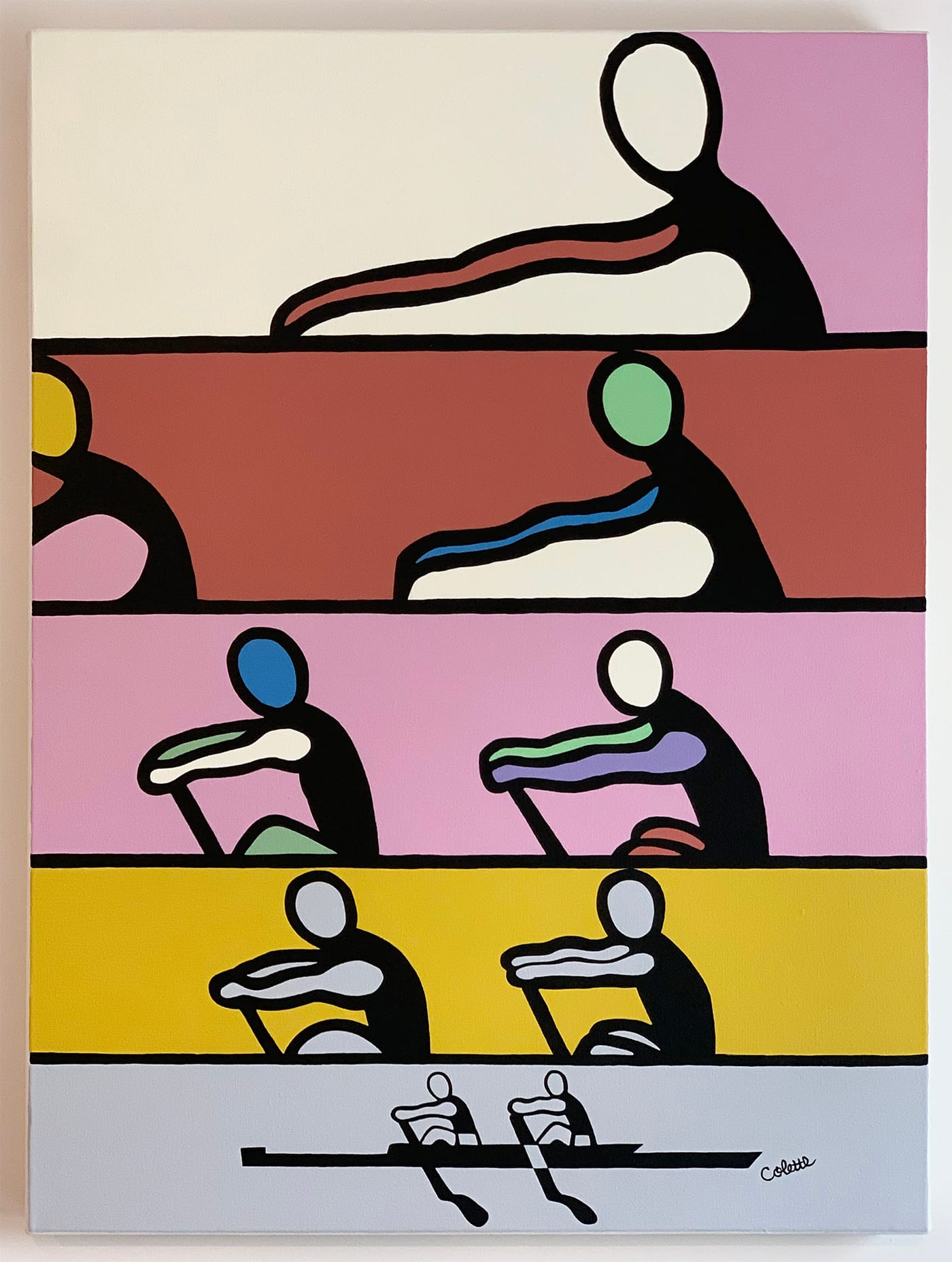 Dana Frankfort (Houston): The first time I saw this painting, it was on eBay. I liked the horizontal bands of color, the black lines that are simultaneously separations, horizons, and boats, the negative spaces (sky) that become positive (arms) and then back again, and the V formation of athletes. The rowers are bent over, in motion, and yet they are still, like in a comic strip. They have arms but not faces, or arms but not oars. The pink behind the top rower is like the sunrise, and the bright white in front of this rower is like light from the coming day. The artist signed her name ‘Colette’ with a single black line that loops and curls like a wet noodle. This painting was listed for auction with no date or artist information, only described as a ‘modernist oil on canvas painting.’ I was outbid, but printed a color photo that I hung on my studio wall.
