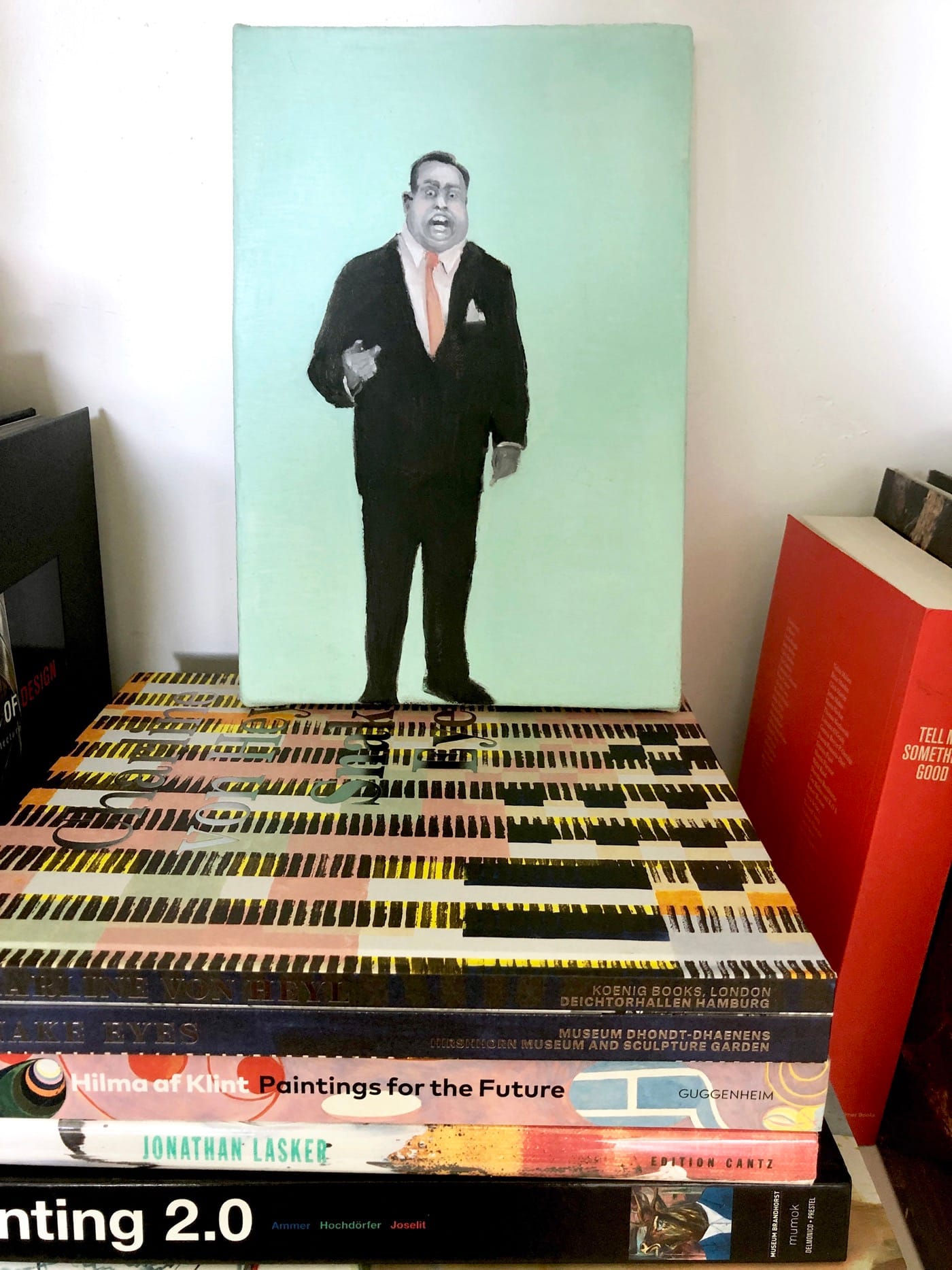 Sometime during the third week of the quarantine I began to rethink my living space by bringing things I ‘needed’ closer to where my daughter and I spend most of our days. This painting found its way onto a wall in the kitchen, which is the center of our home. In addition to the meditative rhythm of Colette’s composition, I have started to look at this as an artwork made by Rachel Hecker, an object that is both real and fake. Like the best things artists collect, this painting now serves as a rich reminder of my connections: to Colette, to Rachel, to my community of painters. Finally, while looking at a painting of a printout of a screenshot of a photo of a painting, I am acutely aware of how everything is interconnected. I like to imagine seeing the original and this new original, based on everything that came before, side by side.