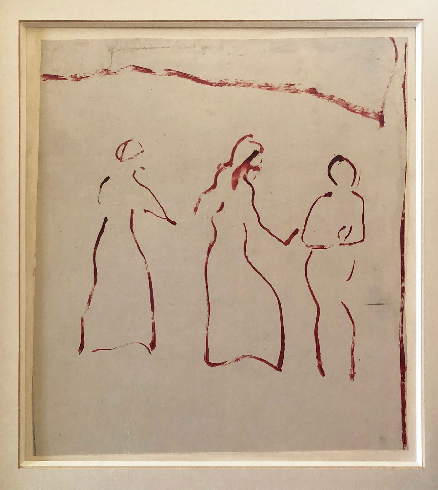 The other work is a drawing by Ferdinand Hodler titled “A Study of the Joy of Nature” (ca. 1910-1913). The drawing is made by the tip of a round brush with the barest amount of red paint. I have always admired Hodler’s large frieze-like compositions, for which this is a study, but I have never, until now, focused on his depiction of touch. Three women move across the suggestion of a green hill. Their long dresses, articulated with two or three brushstrokes, perfectly define the careful movement of their dancing feet. The middle woman leads the figure on the left by the hand and at the same time reaches out to the figure on the right, who appears to recoil in response. Looking at the drawing now I see that touch, not three dancers on a hill, is the subject of the drawing. With the tiniest amount of paint, Hodler captures the subtlest intricacies of human contact.