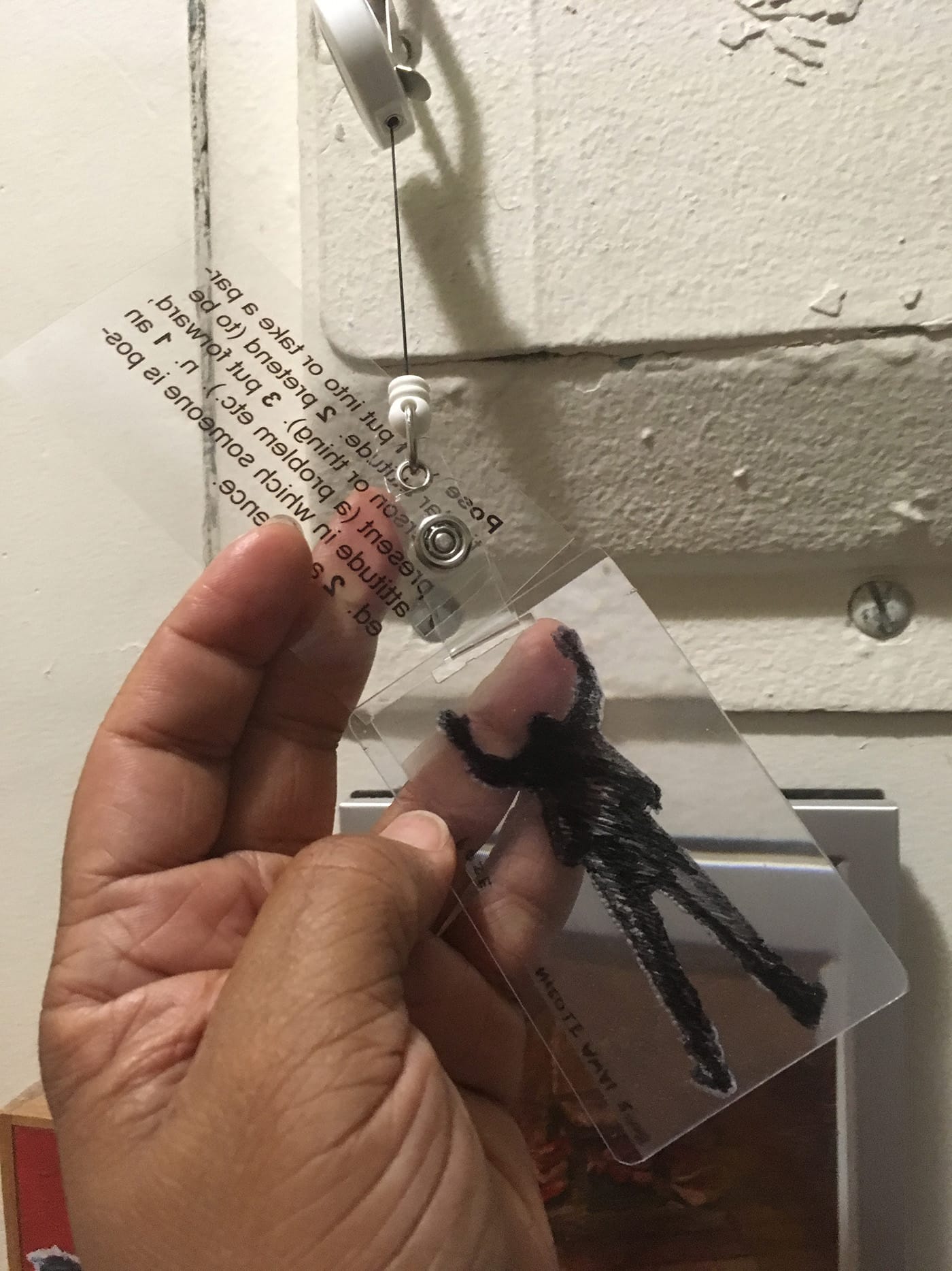 Another work in my salon hangs from the handle of the foyer’s electrical box. I have not thought about it in years, but in the last few weeks it is constantly on my mind. In the early 2000s, I was asked to contribute editions of small, take-away artworks for the annual Skowhegan Gala. I responded to the injustice of the ‘Stop and Frisk’ policy in New York City that was being actively contested at the time. “Pose” alludes to a person of color assuming “the position” at the command of a police officer. The image was scratched onto plastic magnifying cards accompanied by the definition of the word “pose” printed on another clear plastic sheet, suspended on an extension badge pocket clip: