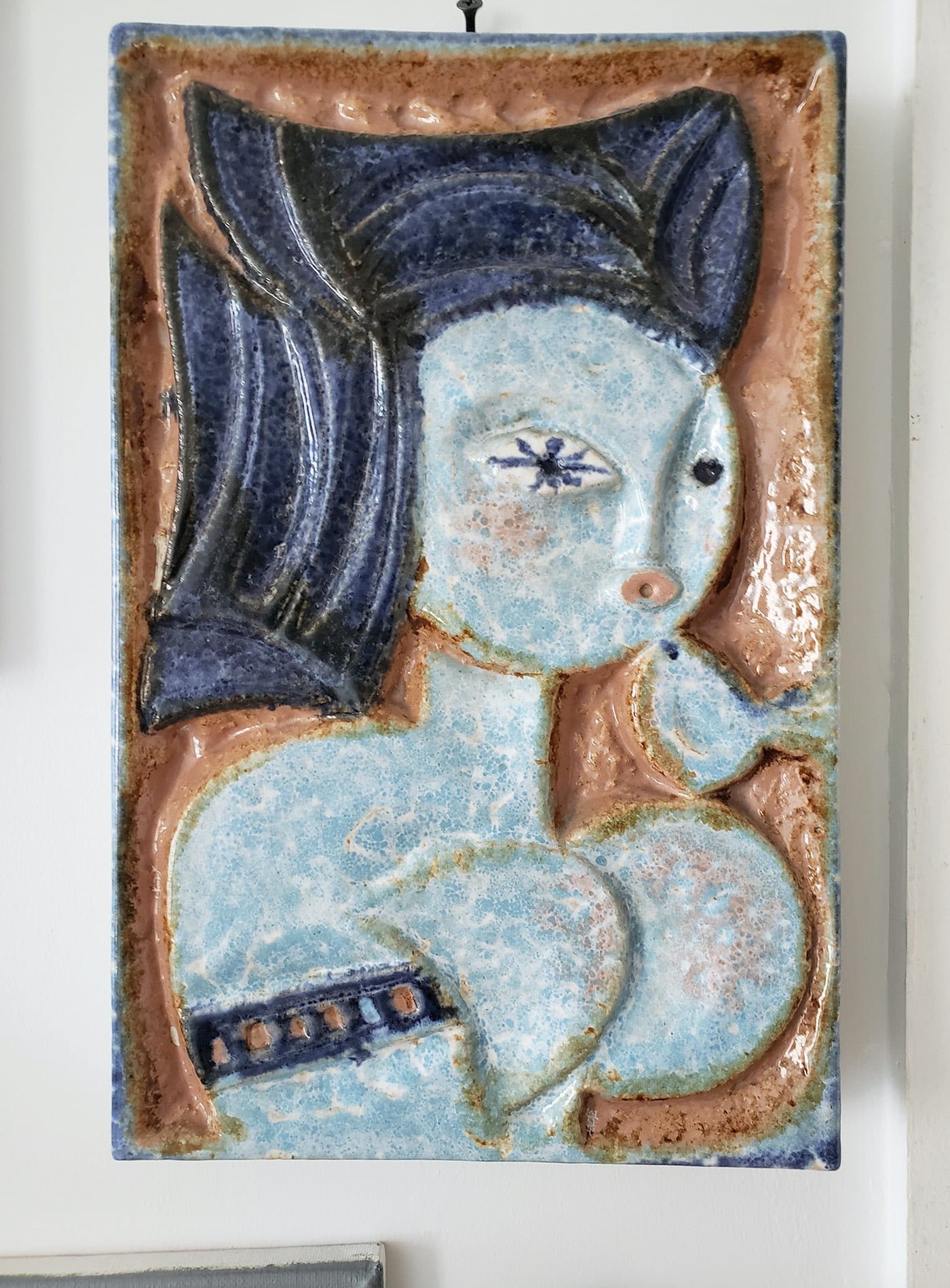 After much searching, I was able to identify the artist of the Blue Nude when I found a signed, clothed version of my wall sculpture. (A few brushstrokes of glaze give her a shirt.) Perhaps my piece is one of a kind, even if it was reproduced with a mold. György Fürtös most likely made my “Blue Nude” in the 1970’s at the Zsolnay Factory , where he was a designer from 1962 to 1999. (Sadly, he passed away in 2010.) The piece is made of Pirogranit, the factory’s proprietary clay for outdoor works.
