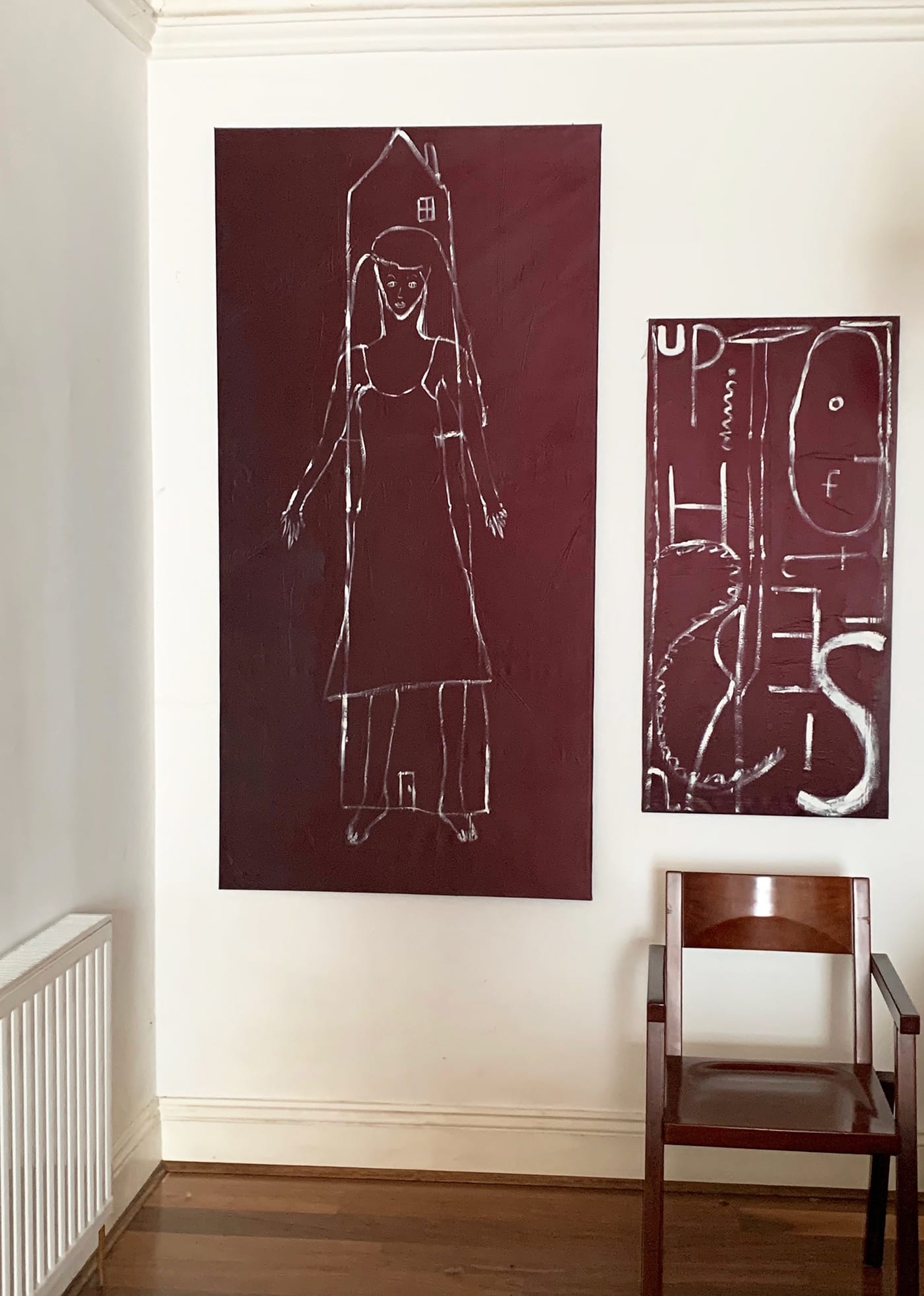This work by Australian artist Jenny Watson hangs on the wall opposite the table I sit at. A diptych, it is made from materials typical to Watson’s practice: oil paint on textile, on multiple panels. Her characteristic minimal scrawled marks and letters across a rabbit-skin glue surface are psychologically potent. The satin taffeta textile is contradictory as it oscillates in the light from lushness to dullness, with the texture and color resonating feminized space. The larger panel is an image drawn in white oil paint of a female figure within a linear structure describing a simple house; the smaller panel is of various shaped letters. Before the pandemic and lockdown, I’d read this image (inspired by the word “up” legible in the text panel) as relating to Watson’s series re-imagining the Alice in Wonderland story — a narrative circling around the figure expanding with her house.