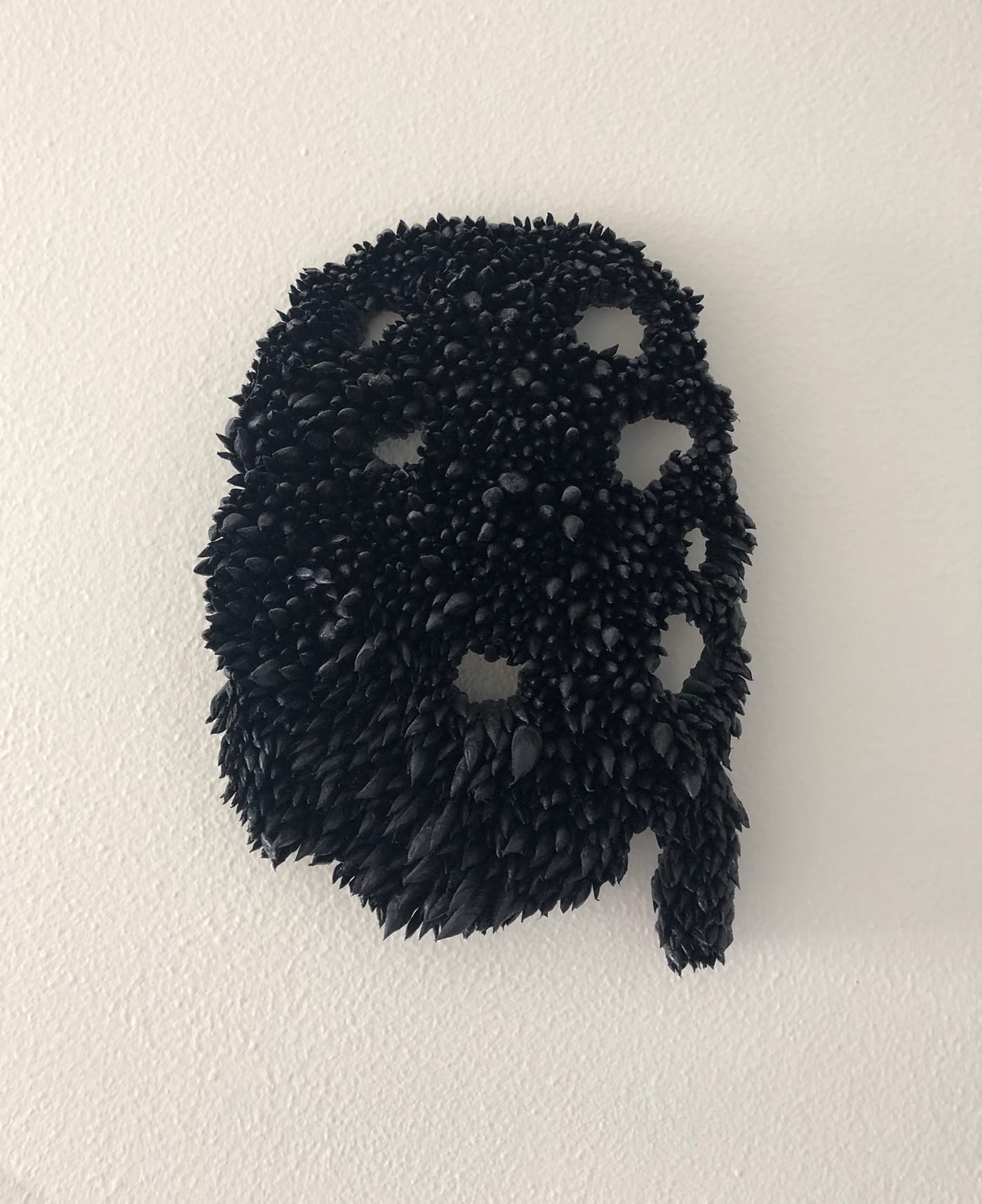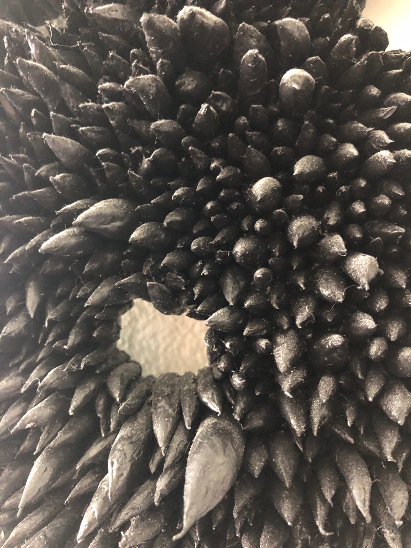 It is made from hundreds of twisted trash bags and though it’s only 10 inches at its longest dimension, I feel this object’s presence as an ever-changing remnant, talisman, witness. It looks back at me. I am drawn to the holes and how the work simultaneously pulls itself together and threatens to fall apart. As in a painting, the time scale is layered, deep and evolutionary. Its creation feels like a devotional practice, and I am catching a glimpse of it in a moment of transition. I know how much strength transmitted by Sandra’s work comes from its liminality. It survives.