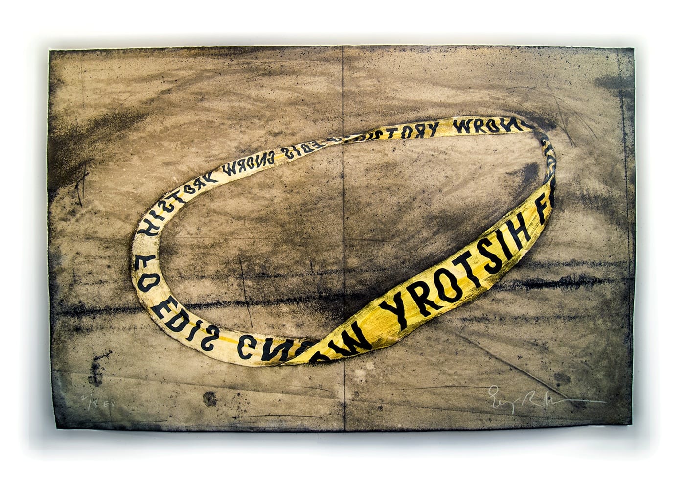 Tanja Softić (Richmond, Virginia): Elysia Mann’s “Linear Progress” (2014) is a screenprint combined with pseudo-etching, a process that creates a scratched, smudged surface resembling well-worn street pavement: cut, splattered, abused over a long period of time. An undulating Möbius loop of yellow police tape reads, with some effort on the part of a viewer, a repeating phrase: “WRONG SIDE OF HISTORY.” A native of St. Louis, Missouri, Mann made “Linear Progress” after the acquittal of the officer who killed Michael Brown Jr. in Ferguson. The work is an enraged elegy. Everything in it — the process, the composition of text, the unforgiving colors — speaks with shocking clarity. Especially now.