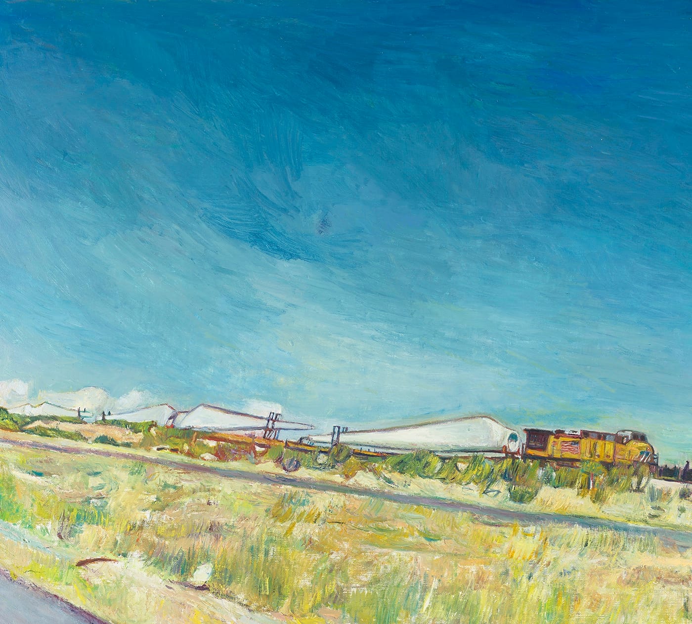 But I also think about what those wind turbine blades the train is carrying represent: a hope for a better future. When times are dark there is the inclination to want to give up. But the Dark Ages led to the Renaissance. We are at a crossroads in our country, in our world, and this painting signifies the possibility for change.
