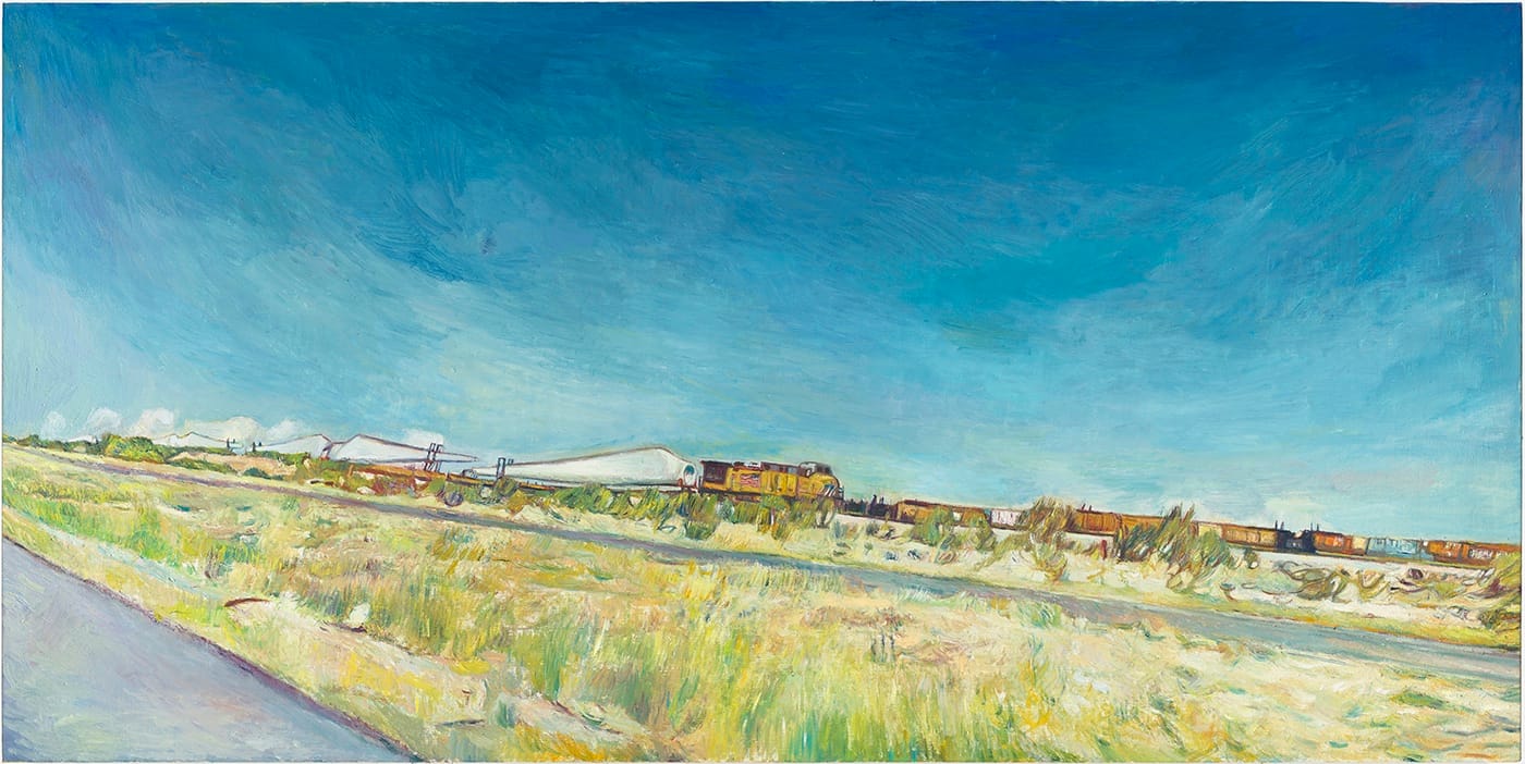 B. Wurtz (Southold, New York): There is a painting of a train by Keith Mayerson in my wife’s and my collection entitled “Wind Turbine Blades — The Great Western Railway.” It hangs in the eating area of our kitchen in our small house in Southold. Before Covid-19 it already had a story: when I got it I had the idea to hang it on that particular wall because outside the house, just 30 feet away, are the tracks of the Long Island Railroad. A few times a day a tiny train goes by heading to or from Greenport. Keith’s painting became part of an installation, so to speak.