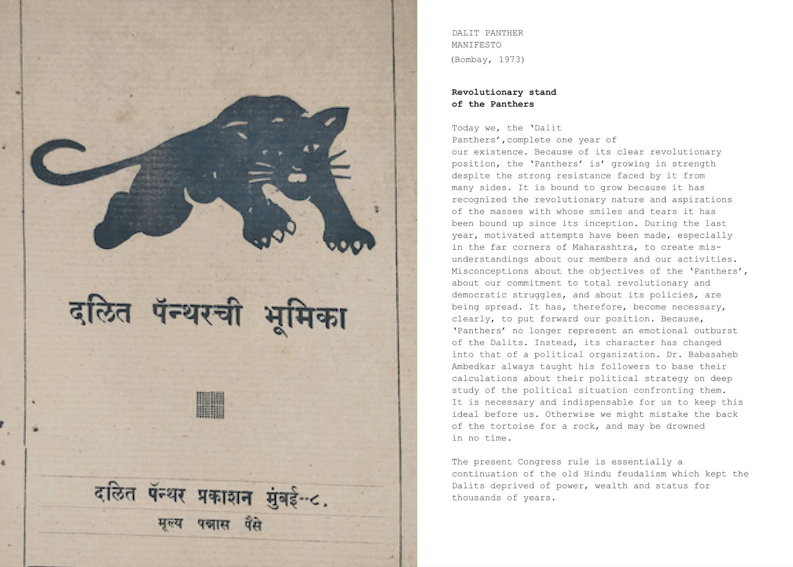 Founded by poets and writers Namdeo Dhasal, Raja Dhale, J. V. Pawar, and Arun Kamble, the Dalit Panther Party (DPP) (1972–1977) was inspired by the Black Panther Party. The Dalit Panthers Manifesto classified “American imperialism” in the same category as “Hindu feudalism.” The Party rallied at atrocity sites, organized marches, boycotted elections, and propositioned direct militant action against their dominant-caste aggressors — direct cues from the Black Panther Party.
