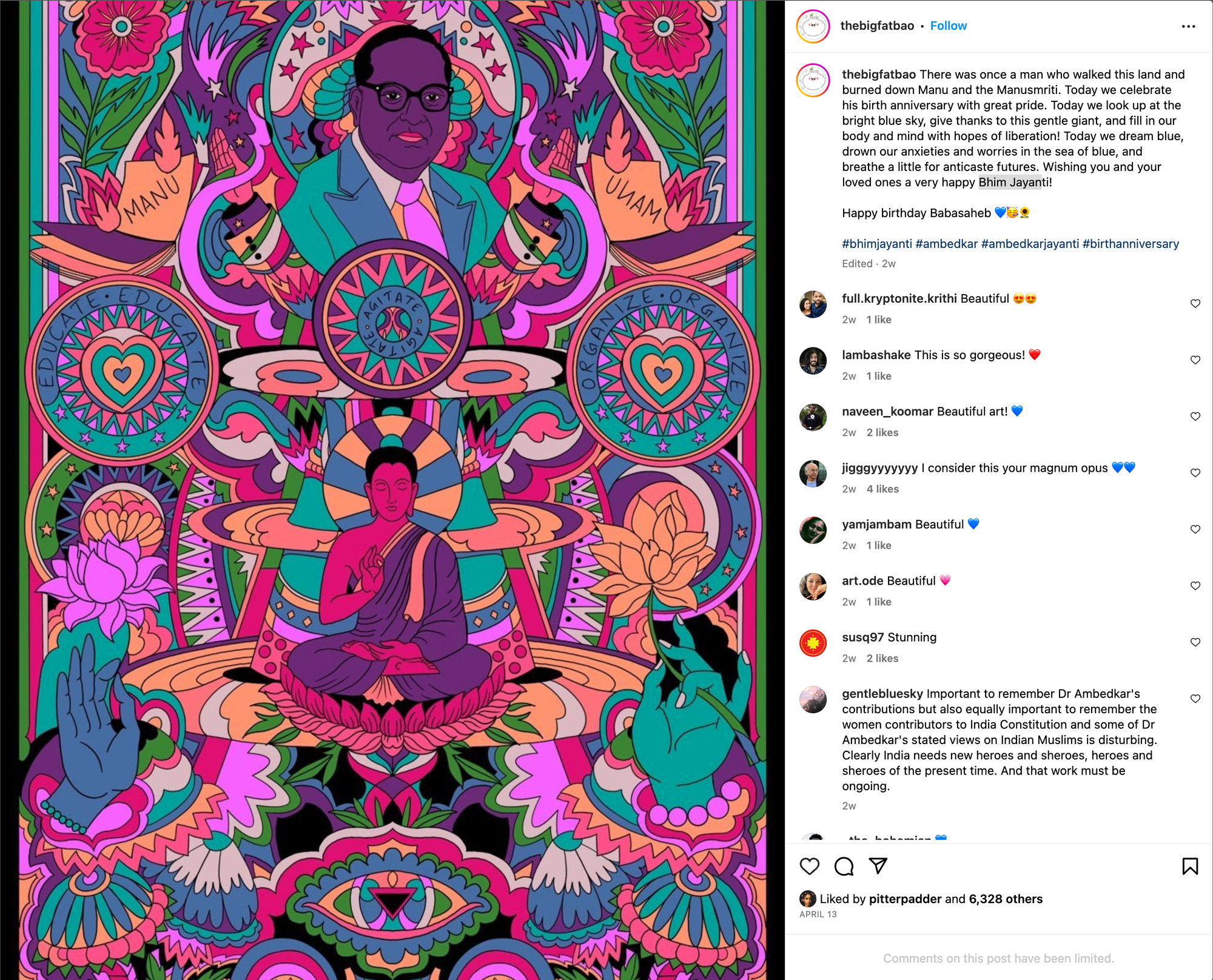 Big Fat Bao, a caste-abolitionist, illustrator, and researcher based in Mumbai, India, and I discussed her April 13 Instagram post, a kaleidoscopic digital mosaic celebrating Bhim Jayanti, Babasaheb’s birthday. It garnered one of the strongest social media responses she has experienced. We wondered how many people may be reading the name Babasaheb and encountering his imagery for the first time.