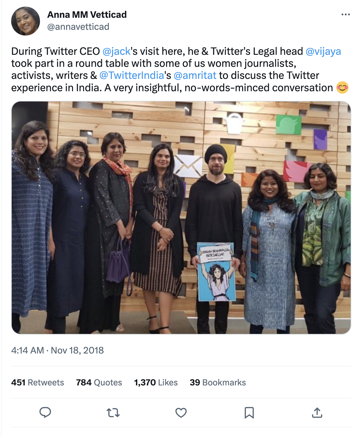 In 2018, Thenmozhi Soundararajan, one of the first openly Dalit women on Twitter and originator of the viral hashtag #DalitWomenFight, and six women journalists met with Twitter CEO Jack Dorsey in India to discuss the vitriol they were facing on the platform. At the end of the meeting, they gifted Dorsey a digitally illustrated poster designed by Soundararajan, snapped a group photo, and posted it to social media. The poster depicted a woman against a blue background holding up a sign that read “Smash Brahmanical Patriarchy.”