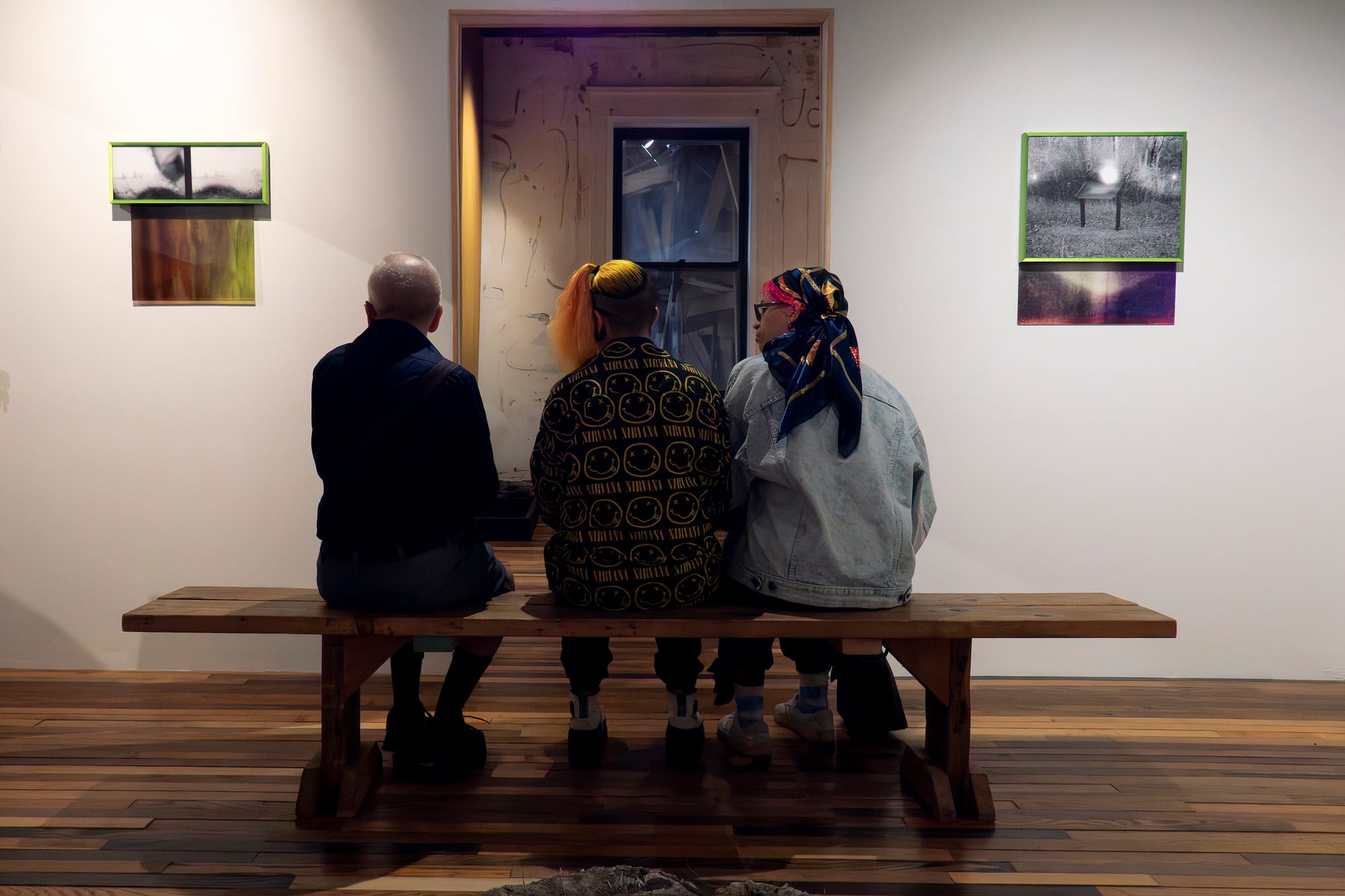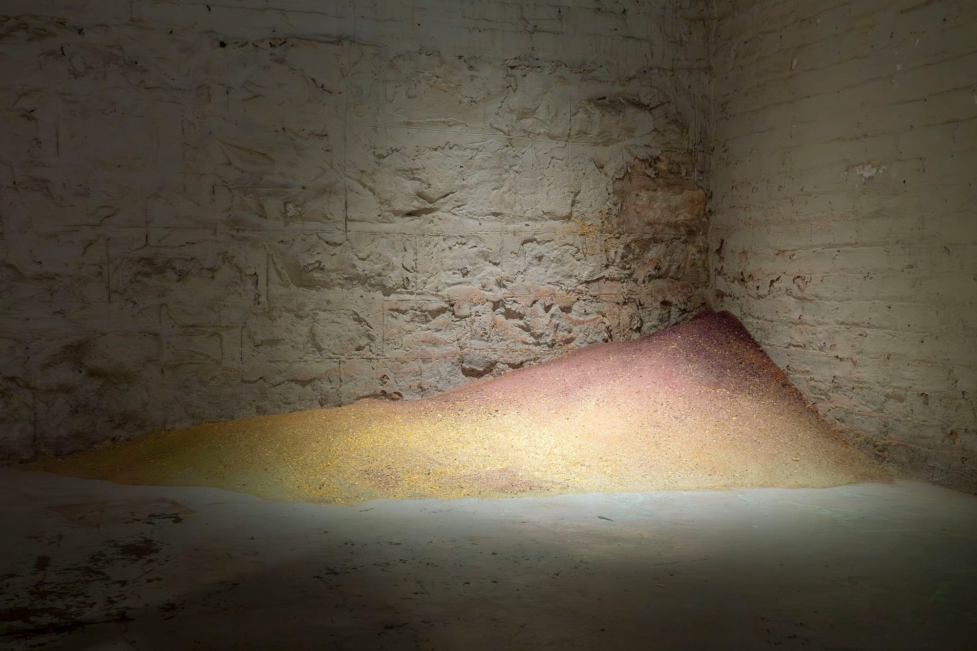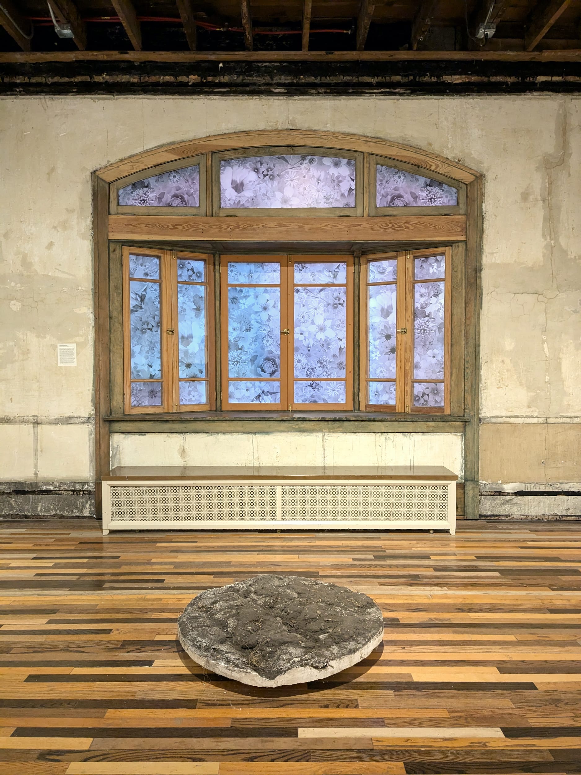Let’s start with the pretty stuff: flowers. In a delightful video, Jan Tichy animated natural elements found in the work of seven important Chicago artists, bringing to life the flat, faux-naif blooms of Roger Brown, colorful collaged florals of Henry Darger, and spooky surrealistic trees of Gertrude Abercrombie. Petra Bachmaier and Sean Gallero, who go by Luftwerk, dumped a gorgeous pile of sunset colors in a corner of the basement. The work, “Extraction,” is actually made up of sand and botanicals sourced from the Chicago Botanic Gardens, which is cool, but it would be cooler to know the names of those plants and the facts of their harvesting. The process of extraction isn’t usually so lovely, though; Jenny Kendler and Giovanni Aloi wrestle with this situation head-on in their memorial to the Bell Bowl Prairie, an 8,000-year-old ecosystem that was in large part destroyed in 2023 by the expansion of the Rockford airport. Using the traditional method of plaster casting, they created a death mask of the prairie, recording its now compressed soil and tire tracks. The sculpture lies on the floor of the old dining room, in front of an elegant bay of windows whose glass has been filled with translucent images of blooms.
