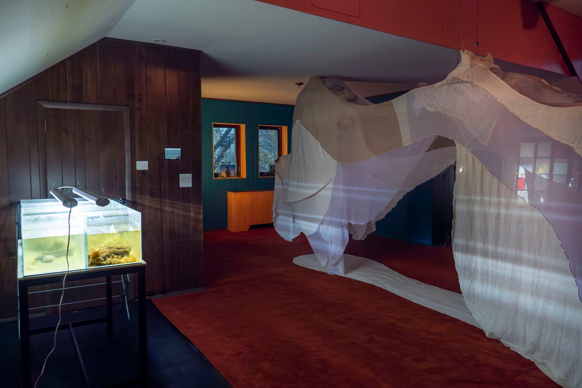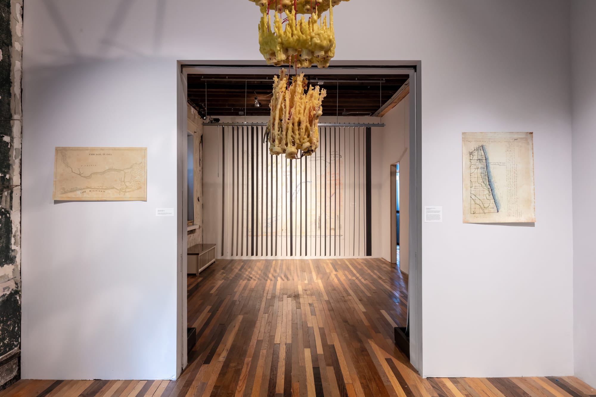 The manse consists of four floors, according to which Myth of the Organic City is more or less thematically and temporally organized. The semi-finished basement covers Chicago history broadly; the first floor tackles land use from Indigenous times through settlement and heavy industry; the second floor considers the city’s waterways and land pollution; and the attic presents hopeful strategies for the future. More than 45 artists and collectives are represented, in artworks that range from traditional documentary photography to conceptual sculptures, performative wall drawings, and science-y experiments. There are lots and lots of maps, historical and contemporary. Sprawling and motley, the show feels like an embodiment of its theme: a vast urban environment, with some areas that are well-tended and fruitful, others barren and toxic, and many a complex hybrid.