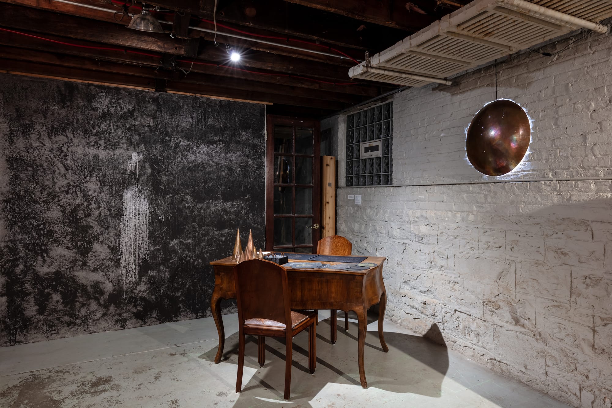 Enter not-so-pretty industry, from the building of the Illinois and Michigan Canal to the formation of US Steel to the development of nuclear reactors, all of it tracked in historical maps as well as a very handy chalk drawing by mathematician Eugenia Cheng, the de facto house muralist. (Another Cheng schema covers the walls of an upstairs bathroom, and one was in a previous show, too.) Aleksandra Walaszek’s “And If This Is Home, Welcome Home,” a set of seven-foot-tall heavy steel vertical blinds in variegated shades of gray, hangs from a motorized rack, opening and shutting with an alarming clang every 30 seconds, like a national border, a fortified shopfront, or a metaphorical door in the face of an array of possibilities. A trio of round, hand-hammered copper light sconces by Rebecca Beachy maps the stars — and, implicitly, their astrological predictions — as they were aligned in the sky during the opening of the Union Stockyards, at the moment the Chicago River was reversed, and through light pollution this past September. A pair of eerie, edgy photo assemblages by Brian Holmes and Jeremy Bolen, framed in iridescent acid-green metal, were produced from film the artists buried in nuclear entombment sites around Chicago. The ugliness of heavy industry and its byproducts, rendered by artists, becomes stunning to the point of productive discomfort.