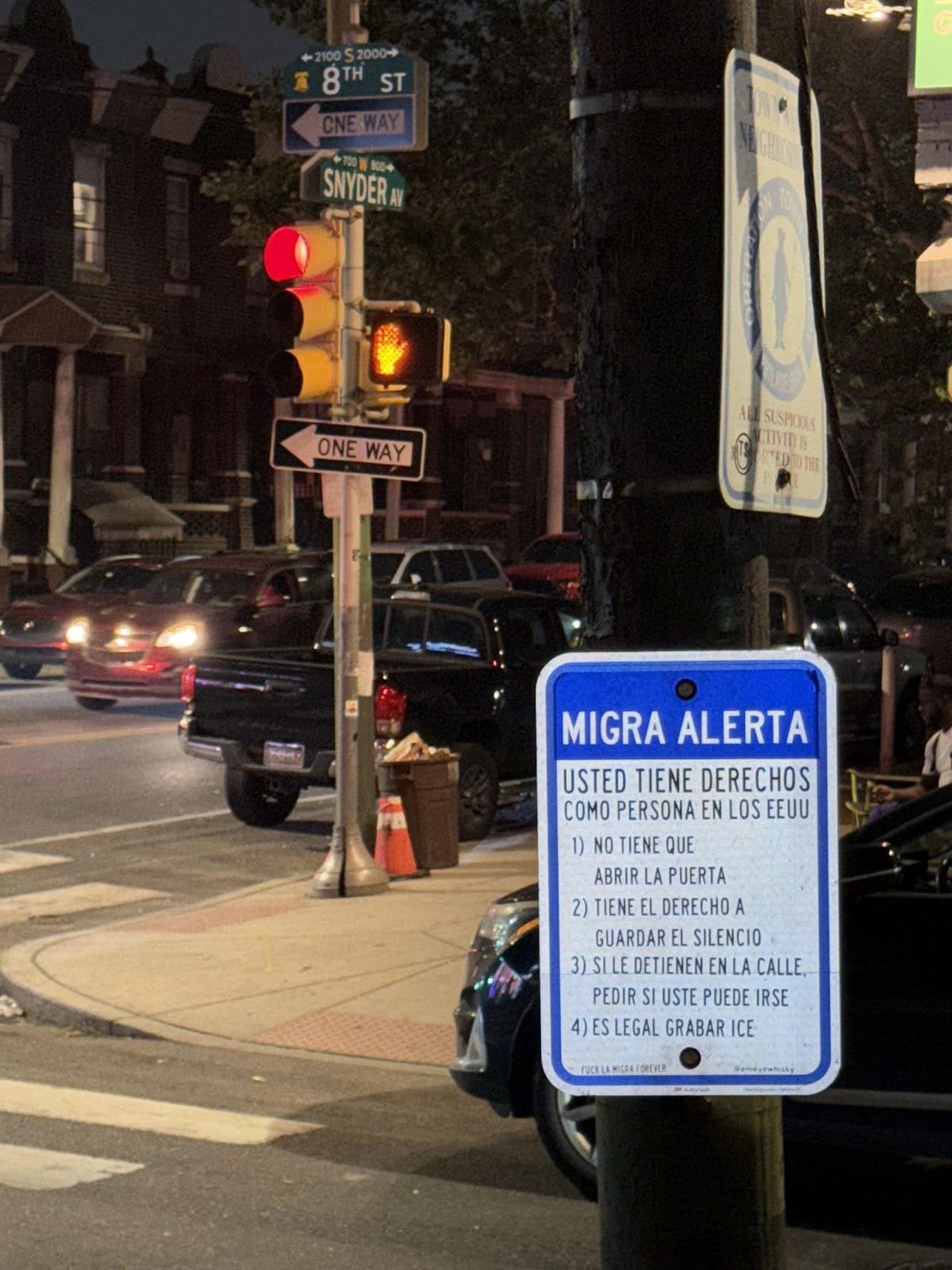 PHILADELPHIA — On a recent afternoon, among a sea of parking signs at the corner of 8th and Snyder in South Philadelphia, a new metal plaque bore a different kind of warning: “MIGRA ALERTA.” Beneath it, a text in Spanish informed passersby of their right to protect themselves from the invasive brutality of Immigration and Customs Enforcement (ICE) officers. Across the street, a similar sign featured the same message in English. Alongside reminders that it is legal to record ICE activity and that individuals have the right to remain silent, smaller letters read: “Fuck la migra forever.”