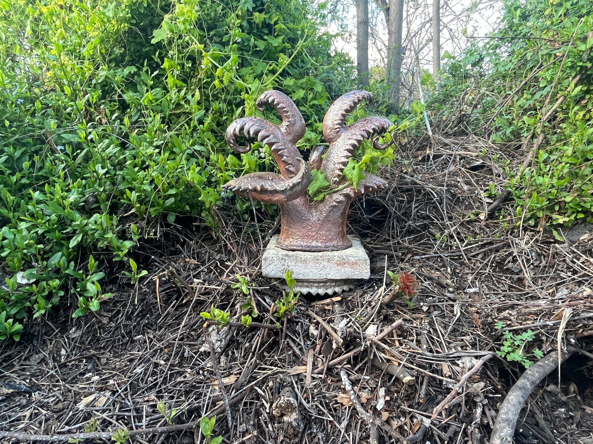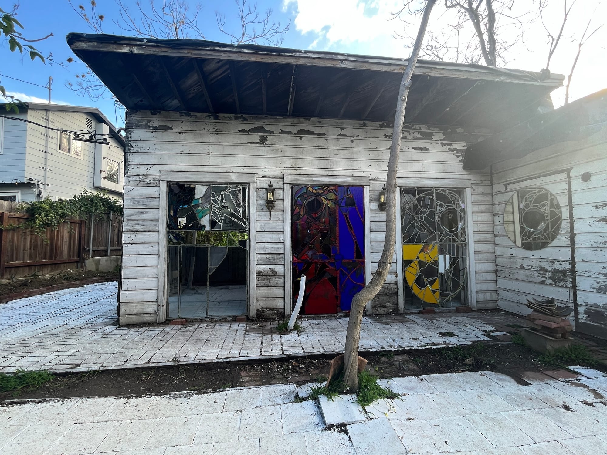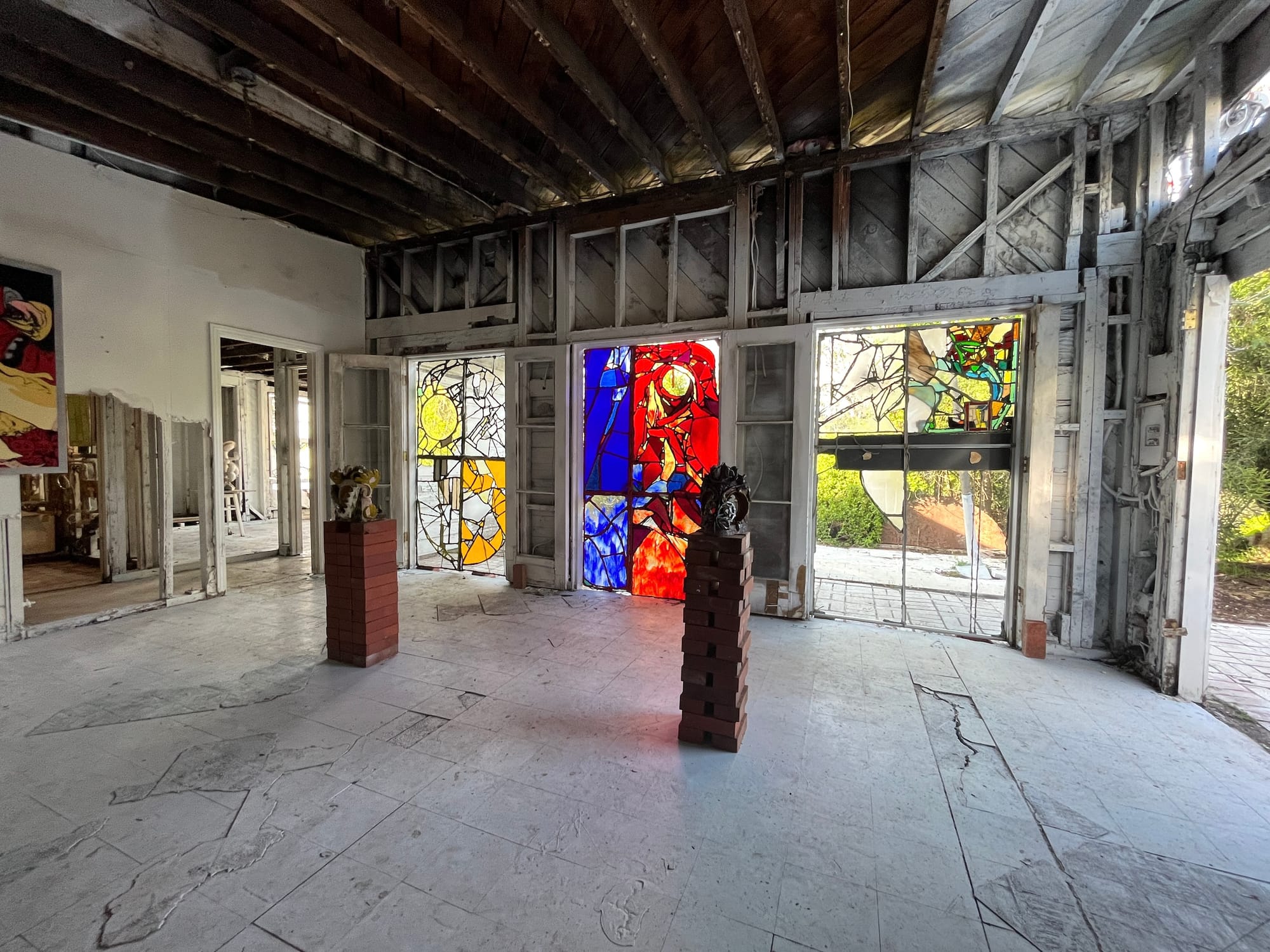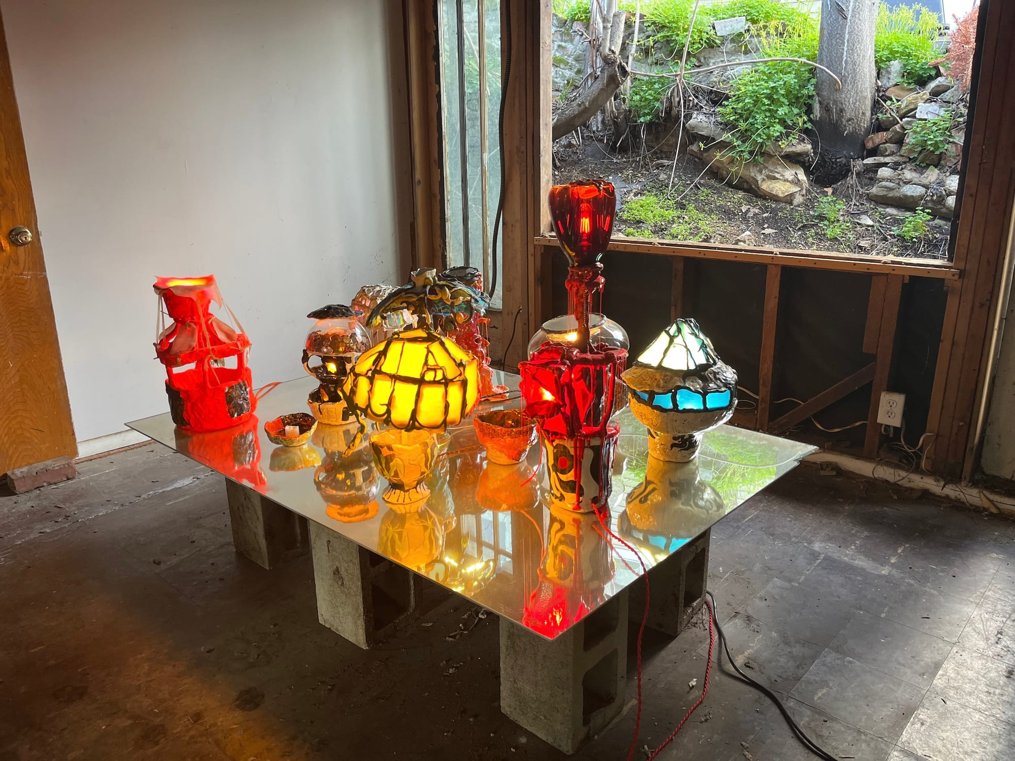 The plot on Future Street sat abandoned for 20 years and shares a parcel with an existing garage that Cuadros uses as a studio. Accessible through an alley down uneven stone steps overgrown with grass and clover, Lux's lamps and Lockwood's fantastical sculptures melted into the environment around them. Stained-glass windows cast color onto the splintered wood flooring, while vines began to subsume the curling arms of Lockwood's vase-like works.