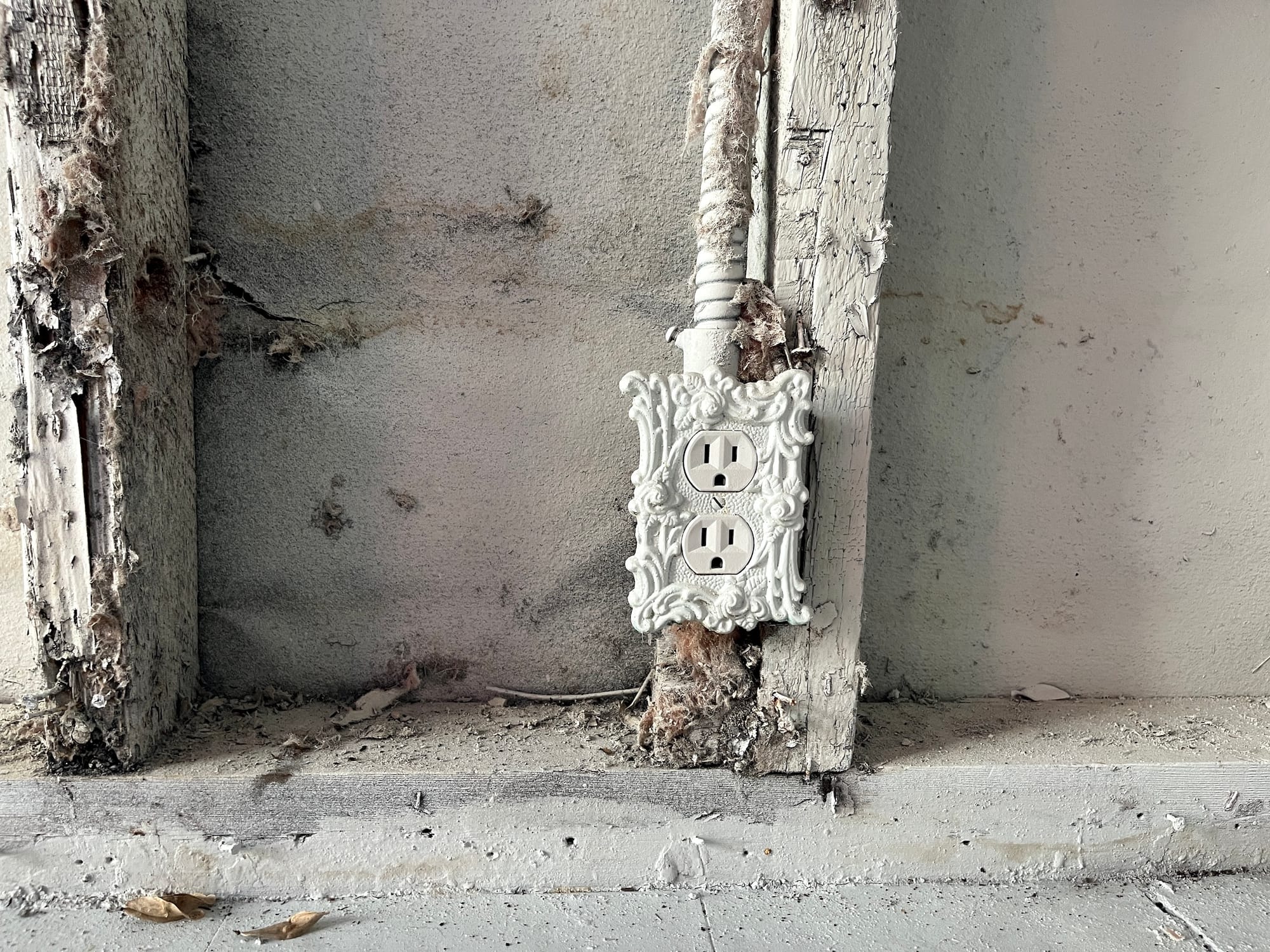Care was evident in every corner of the installation. The organizers rewired the electricity, thanks to handfuls of extension cords and the generosity of neighbors. Every wall plate and outlet was adorned with matching covers. Past the chandeliered first room, Lux's mirrored table of lamps sat in what may have been a dining room, framed by a wide rectangular window.