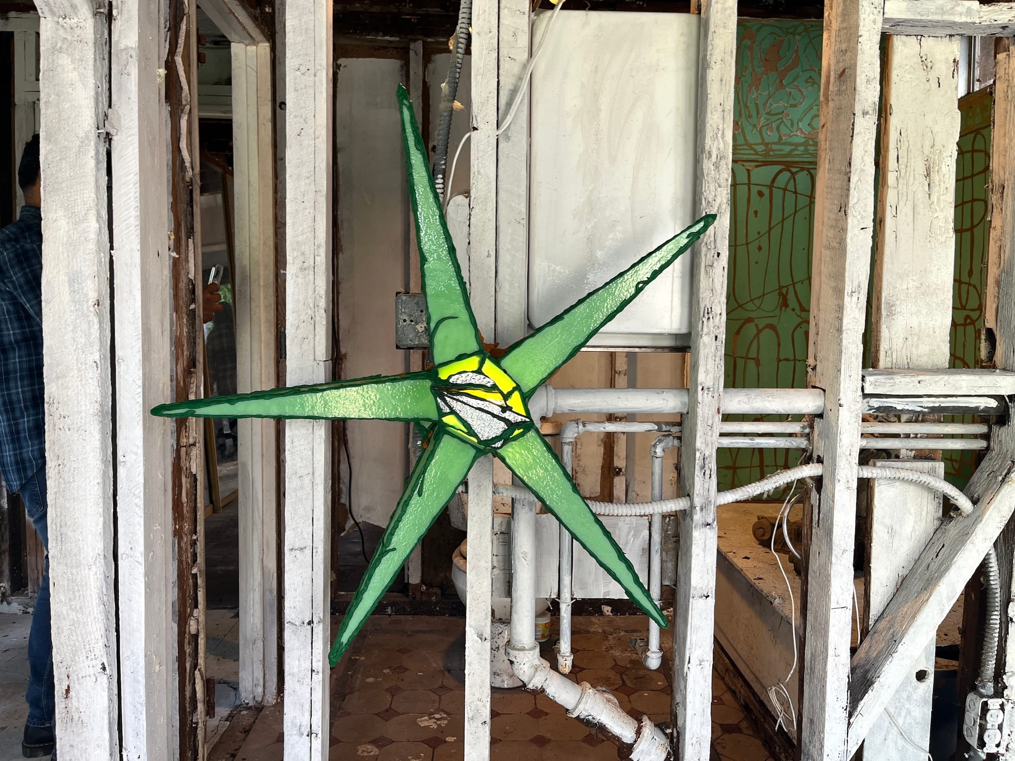 "I wanted that room to look cathedral-esque," said Lux. For Lockwood, found objects around the property guided the installation of her own work, placing them "in cadence" with each other. In “Fire-Femina” (2024), she "flipped over a garden block and wiggled it into the sticks," working intuitively with the house. "Green Star" (2023) by Lux, a five-pointed star with long skinny arms made in green glass and affixed to an exposed stud, was outfitted with a Bluetooth speaker and played music over the patio with a sweeping view of the city below and the mountains beyond.
