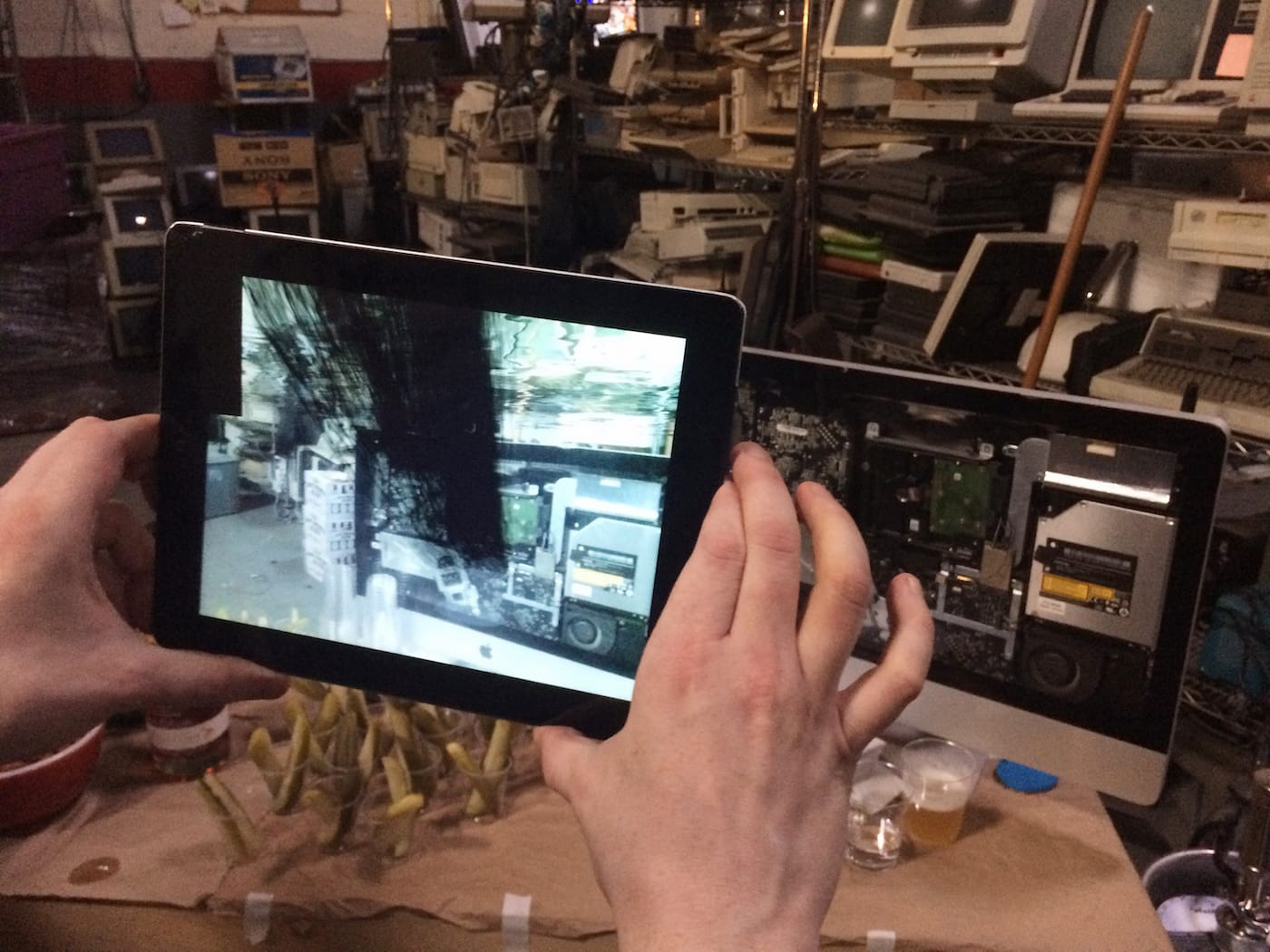 Meanwhile, others were playing a digital scavenger hunt of sorts, created by Charles Sainty. “Remains (After Paris)” was the only piece that sought to strike a serious note. It consisted of an augmented reality application Sainty built after news of President Trump’s withdrawal from the Paris Climate Agreement. Holding one of the cameras of the provided iPads up to an unmarked but connected object resulted in an ominous scene of climate change on screen: a view of an oil spill in the room, or of people suddenly standing below water due to rapidly rising sea levels. Its visuals were slightly gimmicky, but the project’s political bent made it stand out from the other, more purely playful fare.