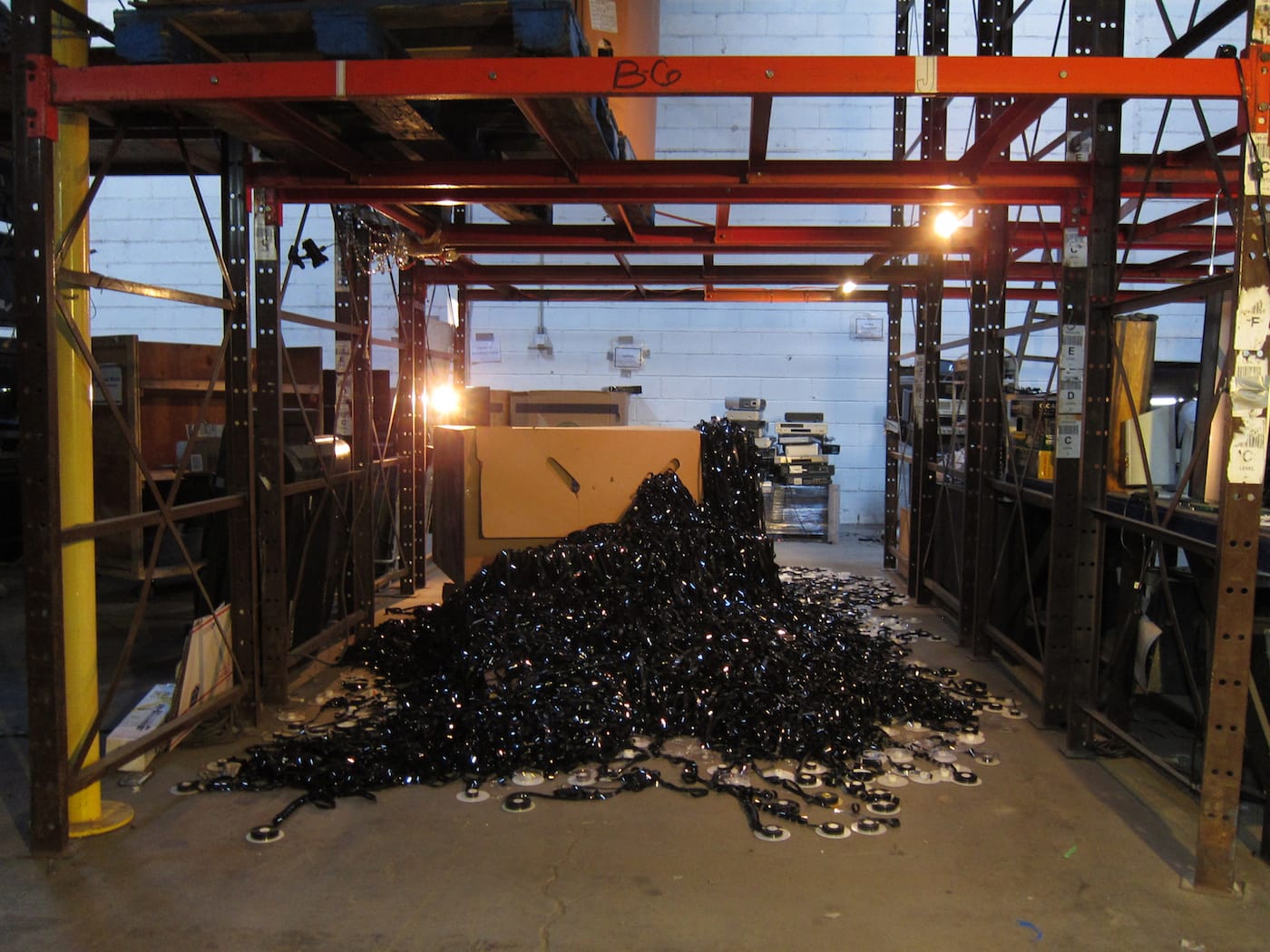 Nearly invisible were two pieces by Jean Shin that seemed like products of the warehouse’s housekeeping system, easily passable as someone’s maniacally organized bundle of cords. They resembled poufs made of carefully wound cords, but the wires really entombed a hidden laptop and a Power Mac G3, forming shells of rubber spaghetti. They were cocoons of hidden data — sturdy, material armor to protect digital memories and other immaterial information.
