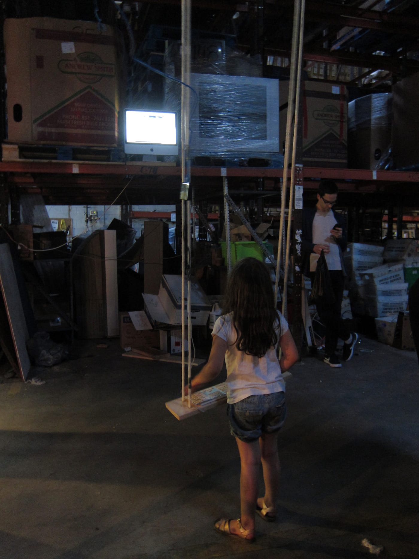 Where electronics were really positioned as obsolete was in Constant Dullaart‘s contribution, a swing whose seat was a keyboard still connected to a monitor a few feet away. Sitting on those buttons, of course, produced only gibberish commands. The aptly titled “Fdghfdegfdthghhgg” was a favorite of the children present.