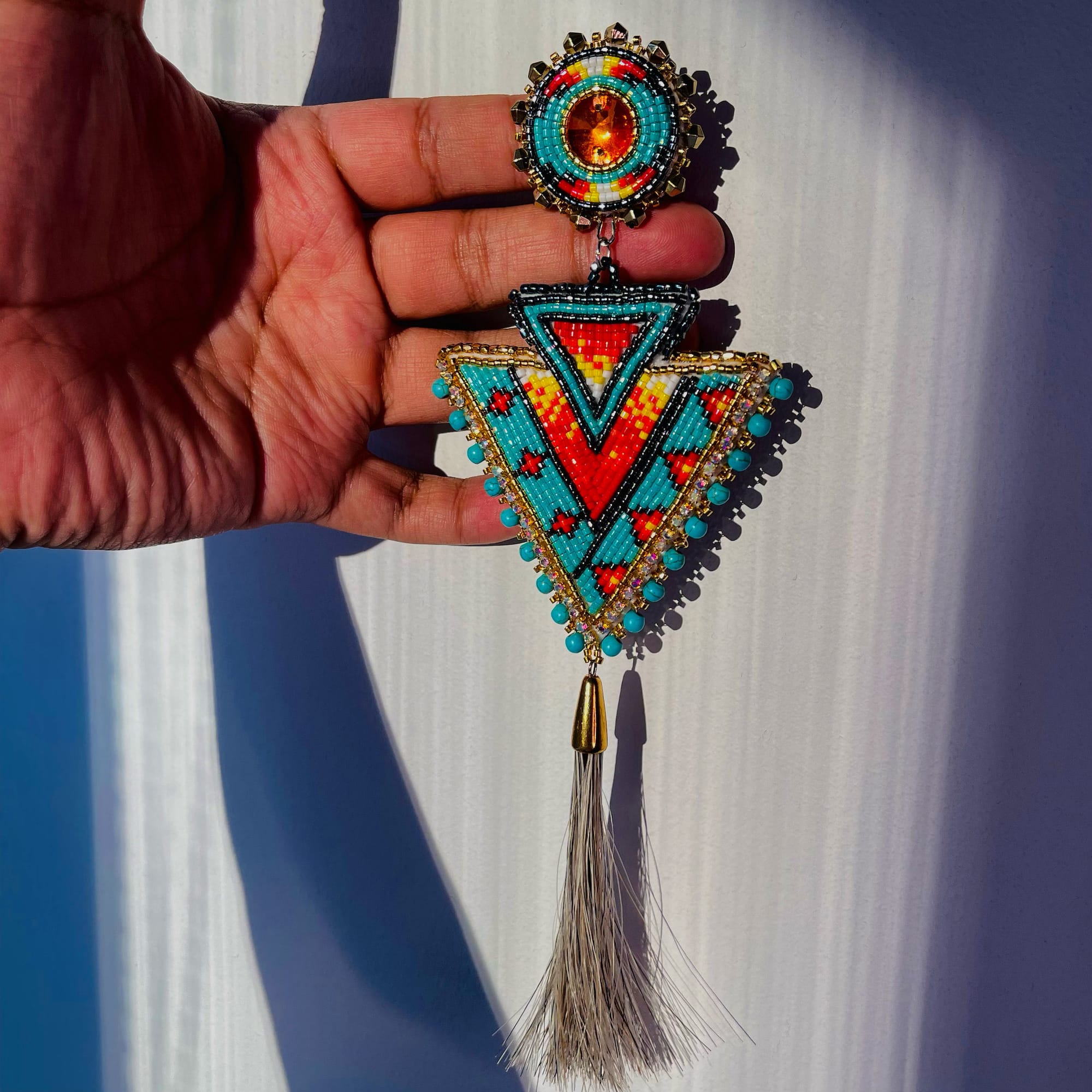 Jori Brennon, a queer Two Spirit Cree artist based in Canada, creates intricately patterned beadwork featuring traditional motifs on a wide range of forms. Current offerings include an orange, yellow, and green bolo tie; cuff bracelets adorned with the silhouettes of buffalo; and shimmering red and gold heart earrings that Brennon says “sparkle like nobody's business.” Prices range from $115 for earrings to $1,143 for beaded cuffs; shop the artist’s store here. —EV