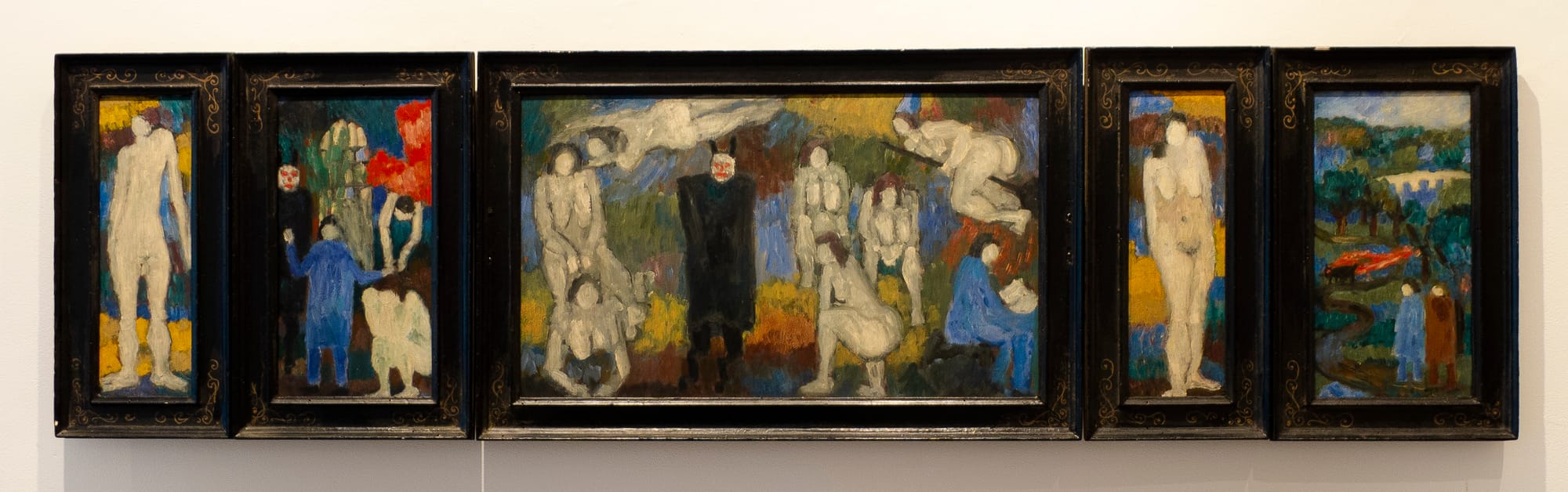 There is a five-panel painting, “Faust” (undated), in a heavy black frame by Jan Müller, another artist born in the 1920s who explored myths in his expressionist paintings and was an influence on a number of artists, including Bob Thompson. Right next to the Müller is a large drawing by Thompson, “Study for Last Painting, after Titian’s Venus and Adonis” (1966), which is in London’s National Gallery. Instead of clutching a spear, as he does in the painting, Thompson has him holding aloft what look like three baseball bats. He also has the figure of Adonis wearing a broad brimmed hat, one of his favorite motifs. It was Dodie Müller, a painter and Jan’s widow, who suggested to Thompson that he study the Old Masters, which he did.