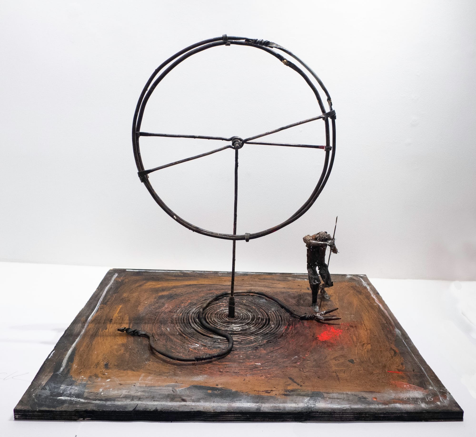 Two sculptures are by June Leaf. One, on a base made of wood, is a figure made of pieces of metal (an armored skin) killing a serpent with a spear. A metal post rises up from the center of the base, holding aloft a wire circle that can spin. Wire is coiled around the post’s base. The snake, the wheel and the coiled wire feel connected, though it is not immediately apparent how. This is one of Leaf’s longtime strengths: the logic of her work is arrived at through the making rather than imposed at the outset.
