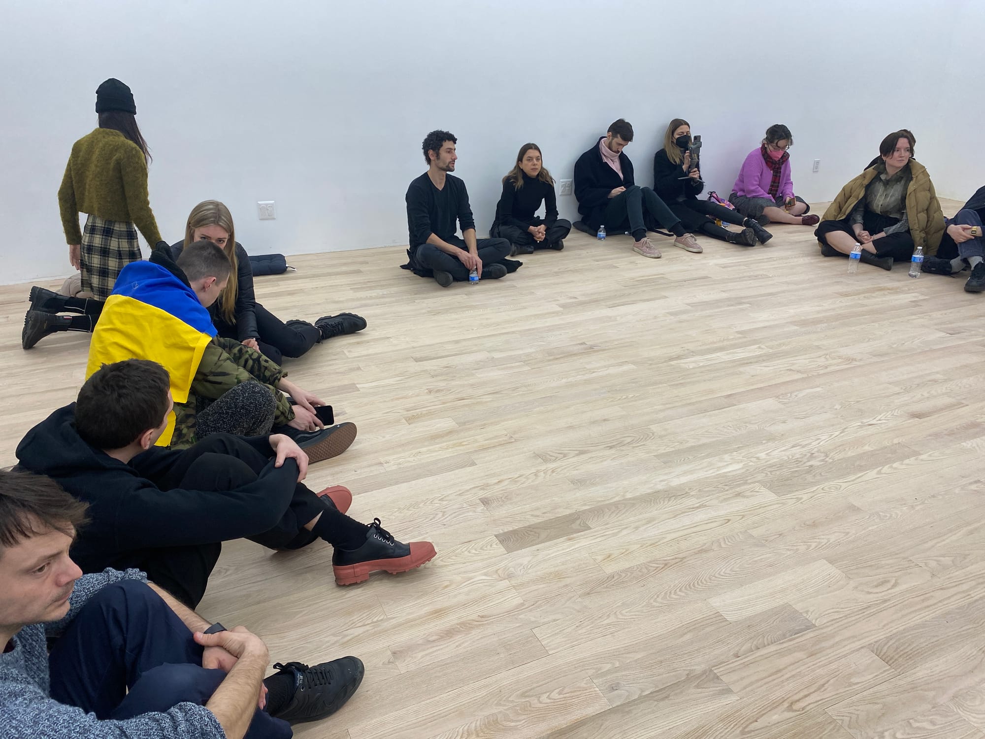 On the evening of Sunday, February 27, Svyatsky and curator Jeanette Bisschops moderated a community meeting at the gallery's Manhattan space, gathering 40 people including artists from Russia, Ukraine, Belarus, Poland, and elsewhere to share personal stories and discuss ways to support Ukraine. The gallery has also put together a public Google document with resources, including links to donate and tools to avoid censorship in Russia.
