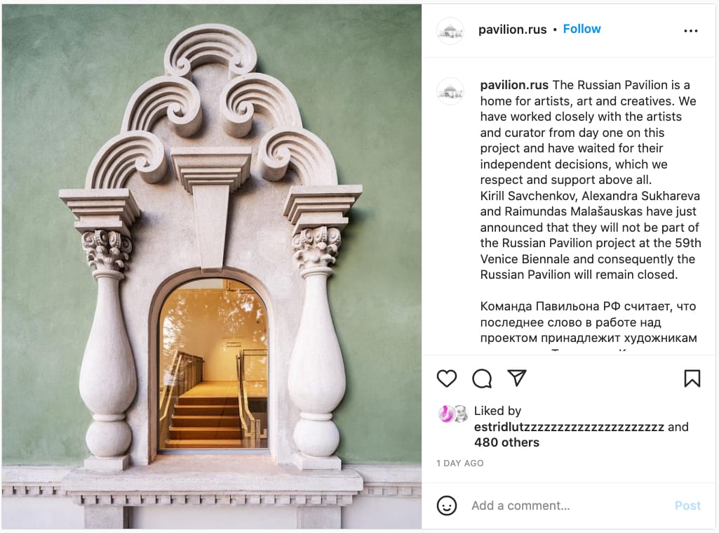 Savchenkov, a Russian-born artist living and working in Moscow, shared a separate statement on Instagram, writing: "There is no place for art when civilians are dying under the fire of missiles, when citizens of Ukraine are hiding in shelters, when Russian protesters are getting silenced."
