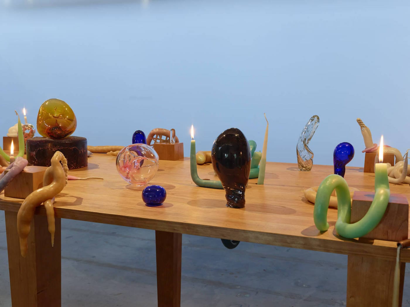 One of the most memorable pieces from this year’s Hammer Biennial was Kelly Akashi’s evocative sculpture suspended above the museum’s courtyard. The flesh-toned, cast object resembled a splayed oyster or layered onion, recalling intimate, interior spaces. Her current solo show Being as a Thing, continues her material explorations, with organic sculptures and installations made out of lead, bronze, glass, fiber, and wax. Many of these are formed into candles that slowly melt away as they provide light by which to see the other works.