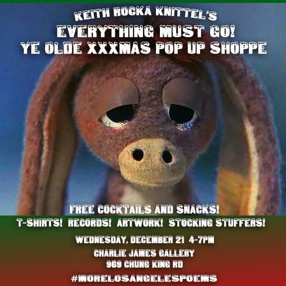 If you’re behind on your holiday shopping or haven’t even started yet, Charlie James Gallery has you covered. In conjunction with Keith Rocka Knittel’s current solo show, More Los Angeles Poems, the artist is throwing a one-day XXXMas Pop Up Shoppe featuring sculptures, drawings, Spiral Jetty lamps, cat-themed items, and records from Rocka Knittel’s own collection. A portion of the proceeds will benefit the Spay Neuter Project of Los Angeles.