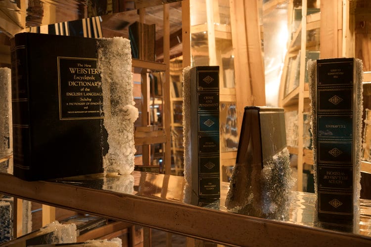 The West Coast debut of Edgar Arceneaux‘s Library of Black Lies comes at a time when the veracity of facts is being questioned, propaganda is being held up as truth, and history is being rewritten. Housed in a wooden shack-like structure, the labyrinthine installation is composed of glass, mylar, mirrors, and books from the artist’s collection covered in sugar crystals, eschewing a clear-cut narrative in favor of a more complicated vision of African-American progress.