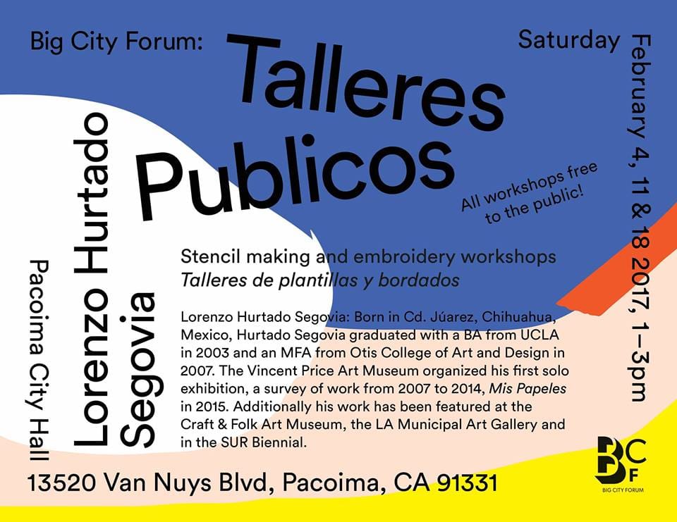 Organized by Big City Forum, Talleres Publicos is a series of community-centered art events and workshops in photography, poetry, dance, design, activism, and more, held at the Pacoima City Hall. This Saturday, artist Lorenzo Hurtado Segovia will hold the first of three stencil and embroidery workshops. The LA-based, Chihuahua-born artist’s work often takes the form of intricate and vibrant weavings that have been exhibited at the Vincent Price Museum, CB1 Gallery, and the Craft and Folk Art Museum.