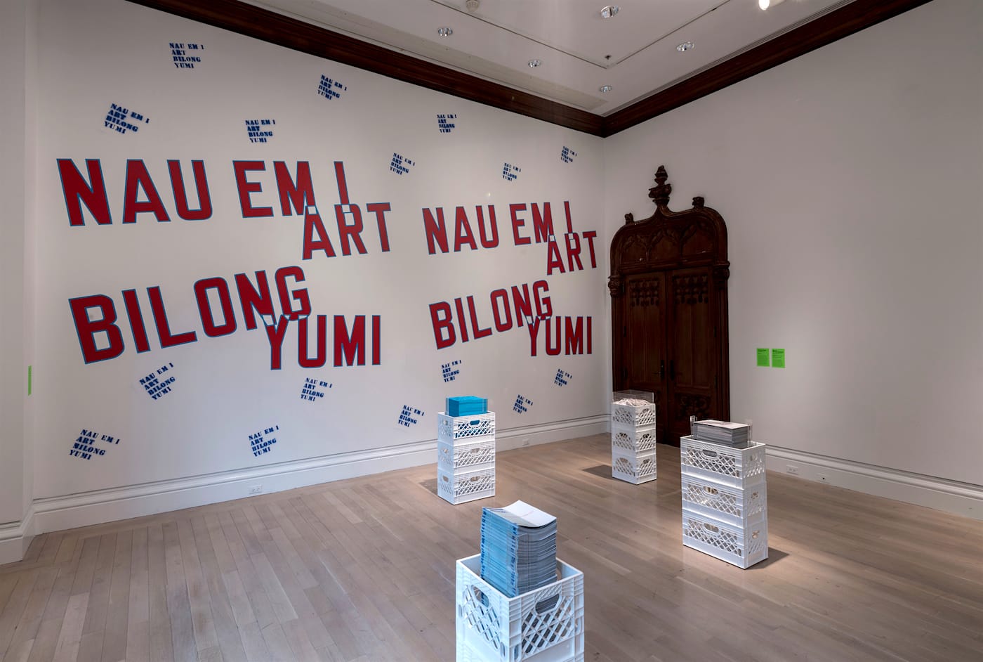 Part of ‘Take Me, I’m Yours’ at the Jewish Museum: Lawrence Weiner, “NAU EM I ART BILONG YUMI (The art of today belongs to us)” (1988–2016) (photo by David Heald, courtesy the artist) (click to enlarge)
