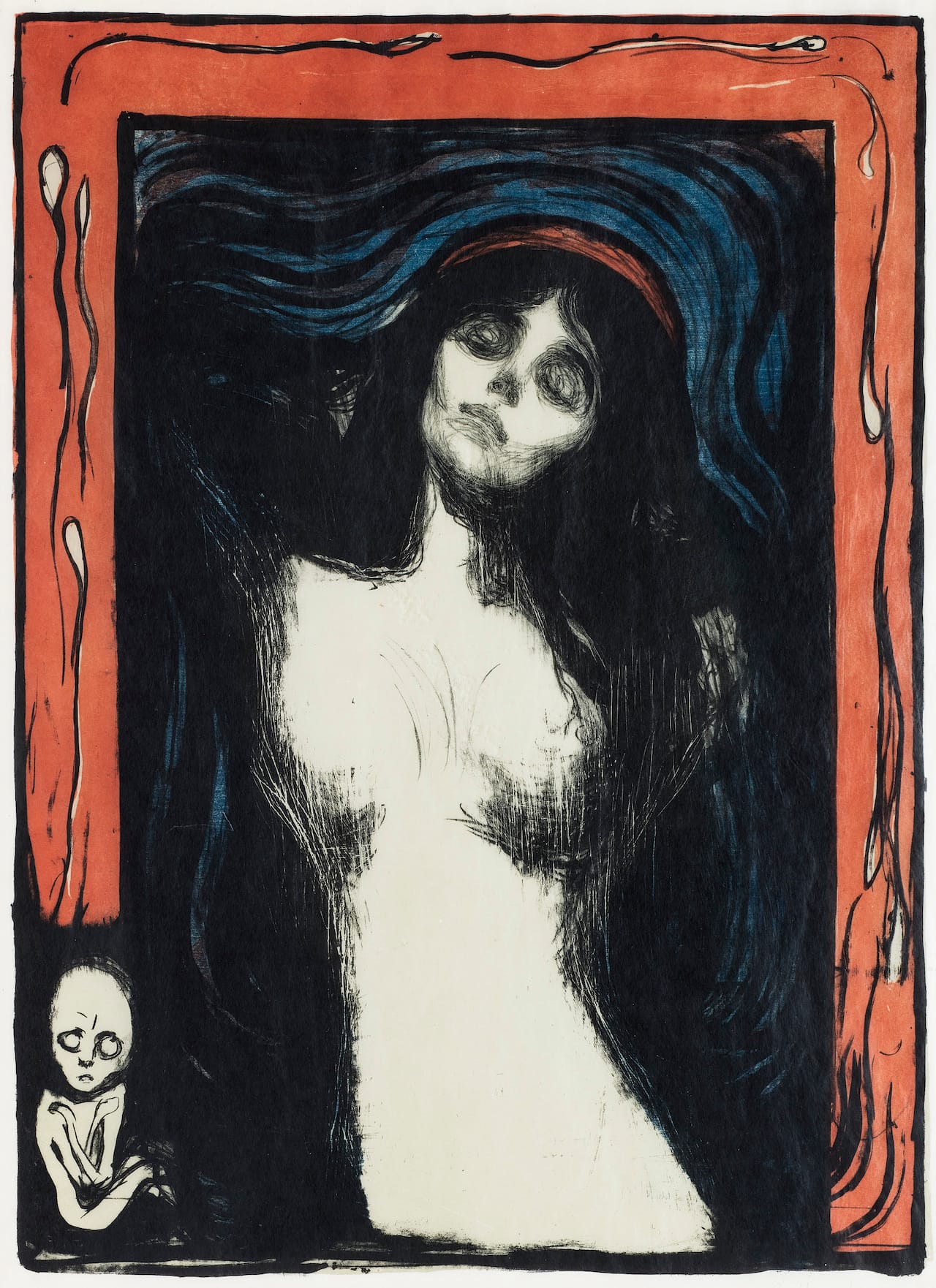 Edvard Munch, “Madonna” (1895/1912–13), colored lithograph in black, red and light olive green, and sawn woodblock or stencil in blue on light golden Japan paper, 23 5/8 x 17 3/8 inches, Collection of Catherine Woodard and Nelson Blitz, Jr. (© 2016 Artists Rights Society [ARS], New York)
