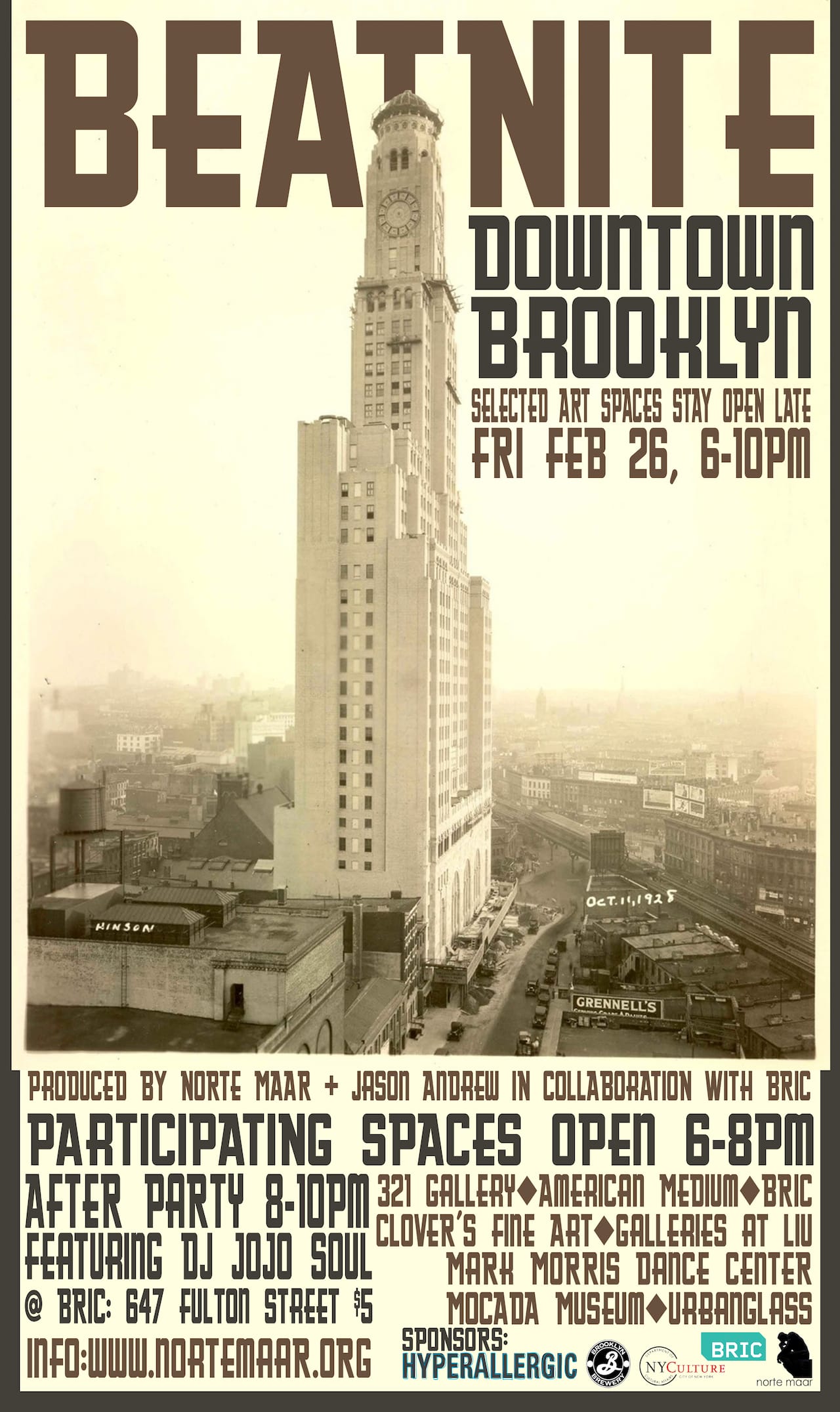 Beat Nite can be a bit exhausting — so many spaces, so little time — but it’s also a great impetus for gallery hopping. And one of the things the organizers, Norte Maar, do best is focusing on new or surprising spaces. In this case, they’re shining a light on a whole underappreciated art neighborhood: Downtown Brooklyn. I wouldn’t have thought there’d be enough spaces to sustain a Beat Nite there, yet the list for this — which includes MoCADA, American Medium, and Boomerang dance group rehearsing at Marks Morris Dance Center, to name just a few — looks terrific. (And I’m not just saying that because Hyperallergic is the media sponsor.)