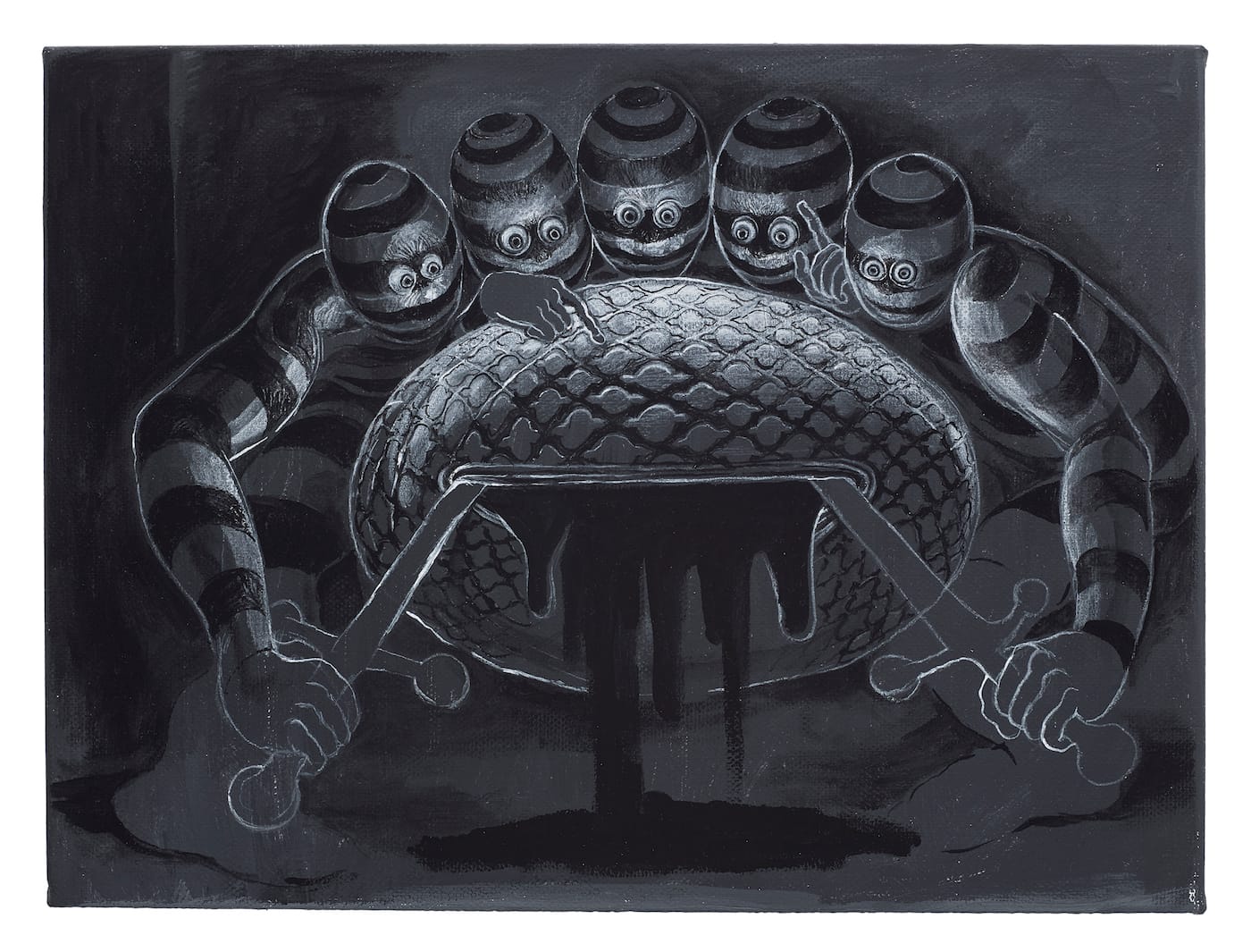 Rebecca Morgan’s drawings, ceramics, and paintings are equal parts R. Crumb grotesquerie and Jan Steen humor, as she illustrates the darkness of country life in Pennsylvania. Mining her Appalachian roots, Morgan explores poverty and addiction in portraits like one featured in this show, of a woman smoking a corn cob pipe, her yellow teeth and blotchy skin hinting at the meth overtaking the moonshine.