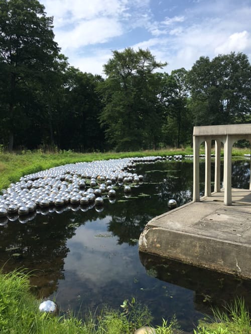 Yayoi Kusama’s “Narcissus Garden” is currently on view beside Philip Johnson’s Pavilion in the Pond (1962). The work consists of 1,300 floating steel spheres that gently collide and clatter against one another in the summer breeze. Originally created for the Venice Biennale in 1966, Kusama’s latest installation marks the 10th year of public access to the Glass House site. The installation is accompanied by “PUMPKIN” (2015), an enormous steel sculpture installed in the vicinity of Johnson’s iconic home. In September, the “walls” of the Glass House will be covered with polka dots, transforming the space into one of Kusama’s “Infinity Rooms.” “Narcissus Garden” is a simple, beautiful, and complimentary accompaniment to Johnson’s home. Book a tour while you can. —Tiernan Morgan