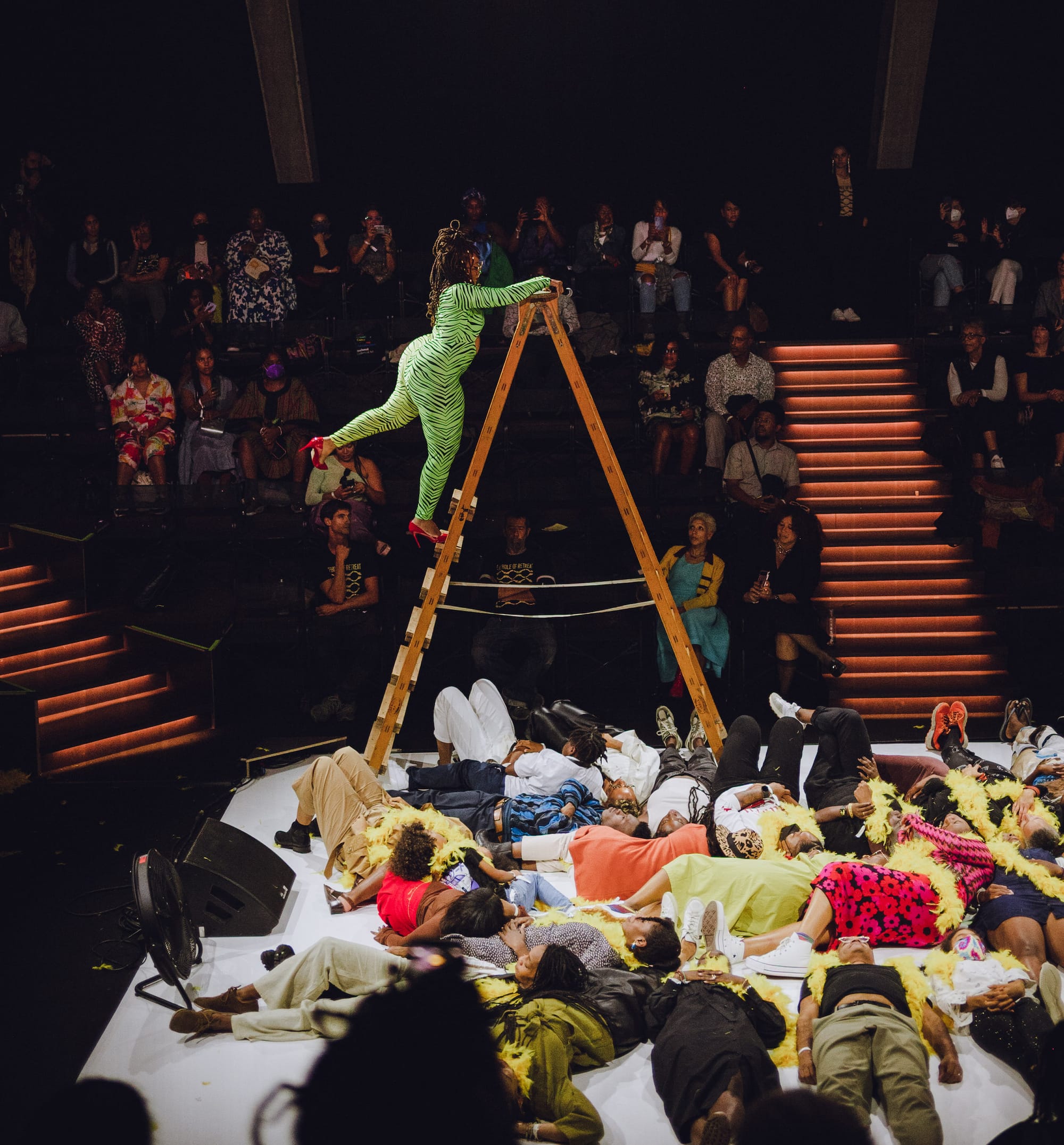 Known for her trademark performance uniform consisting of an unforgettable neon green zebra-striped catsuit, Evans works as an adjunct professor at Brooklyn College, Fordham University, and New York University when she is not staging guerrilla-style community shows at venues like El Museo del Barrio, the Weeksville Heritage Center, the Barnes Foundation, and the Crystal Bridges Museum.