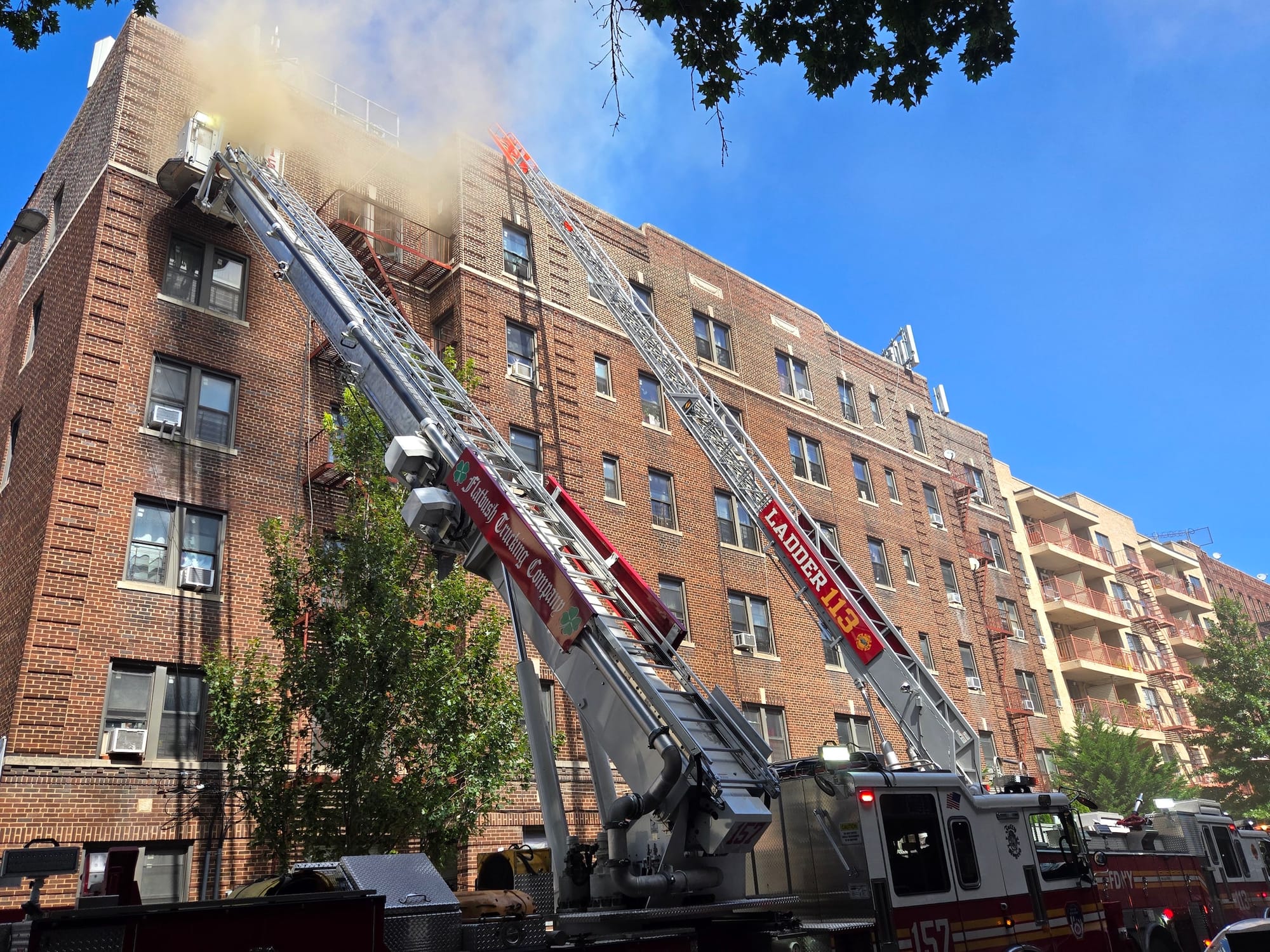 The blaze broke out shortly before 1pm, after a building contractor had been called to repair a roof leak that was causing mold. Evans had been working from home and emailing with a curator about an upcoming project when she and her partner saw smoke coming from the roof. The contractor initially requested a few buckets of water, but then asked them to call the fire department. Firefighters had the blaze under control by 2pm, according to an X post by the New York City Fire Department (FDNY).