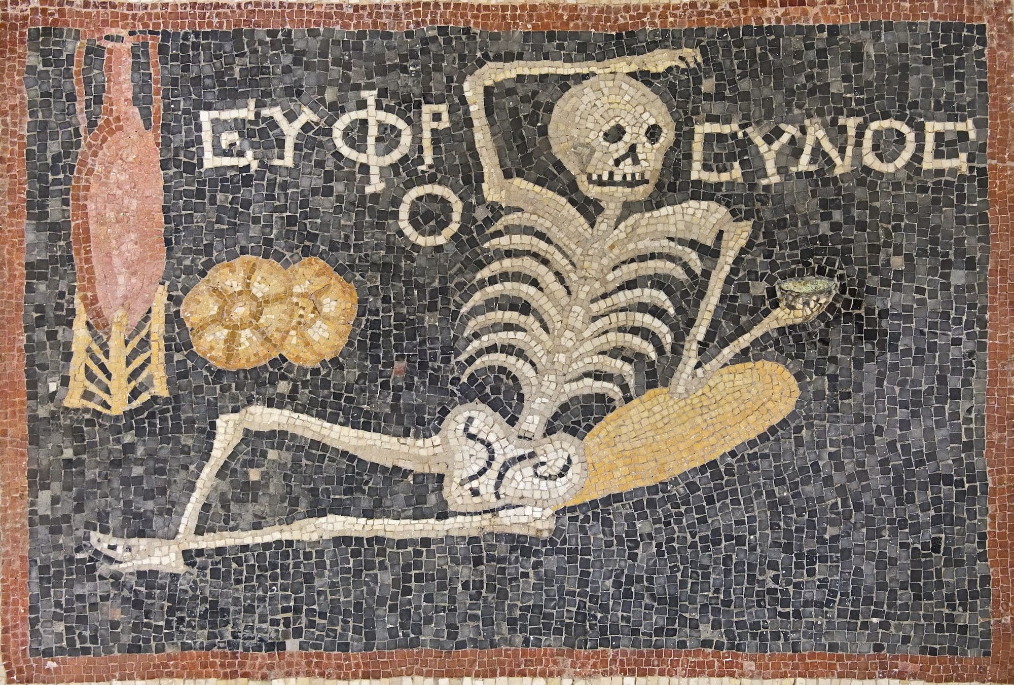 In Pompeii’s ruins, buried beneath three meters of volcanic ash, was a two-millennia-old mosaic concerning the transitoriness of all things. Now exhibited in the National Archeology Museum in nearby Naples, similarly death-haunted by the same volcano that rendered Pompeii a ghost town, the so-called "Memento Mori" mosaic features in colored tesserae and mortar the cackling visage of a black-eyed skull balanced atop both a butterfly — symbol of the soul — and the ever-turning wheel of fortune, all of it beneath a triangular leveling device known as a libella, as if to take the full measurements of a finite life. Dated to the first few decades of the Common Era, and then preserved in 79 CE beneath that powdery volcanic effluence, the morbid mosaic served a pedagogical purpose: to remind the wealthy owner of the villa where it was displayed that they, too, shall die. This is far from the only example of a memento mori within the necropolis beside the Bay of Naples. Not far away was another mosaic rendered in black and white stones of a spindly, smiling skeleton holding dual wine jugs, a playful carpe diem exhortation not unlike that in the apostle Paul’s First Epistle to the Corinthians, written around the same: “Let us eat and drink, for tomorrow we die.”